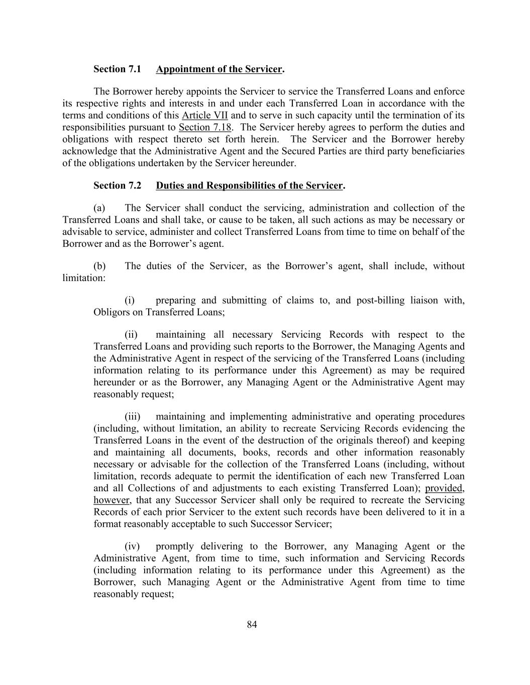 Section 7.1 Appointment of the Servicer. The Borrower hereby appoints the Servicer to service the Transferred Loans and enforce its respective rights and interests in and under each Transferred Loan in accordance with the terms and conditions of this Article VII and to serve in such capacity until the termination of its responsibilities pursuant to Section 7.18. The Servicer hereby agrees to perform the duties and obligations with respect thereto set forth herein. The Servicer and the Borrower hereby acknowledge that the Administrative Agent and the Secured Parties are third party beneficiaries of the obligations undertaken by the Servicer hereunder. Section 7.2 Duties and Responsibilities of the Servicer. (a) The Servicer shall conduct the servicing, administration and collection of the Transferred Loans and shall take, or cause to be taken, all such actions as may be necessary or advisable to service, administer and collect Transferred Loans from time to time on behalf of the Borrower and as the Borrower’s agent. (b) The duties of the Servicer, as the Borrower’s agent, shall include, without limitation: (i) preparing and submitting of claims to, and post-billing liaison with, Obligors on Transferred Loans; (ii) maintaining all necessary Servicing Records with respect to the Transferred Loans and providing such reports to the Borrower, the Managing Agents and the Administrative Agent in respect of the servicing of the Transferred Loans (including information relating to its performance under this Agreement) as may be required hereunder or as the Borrower, any Managing Agent or the Administrative Agent may reasonably request; (iii) maintaining and implementing administrative and operating procedures (including, without limitation, an ability to recreate Servicing Records evidencing the Transferred Loans in the event of the destruction of the originals thereof) and keeping and maintaining all documents, books, records and other information reasonably necessary or advisable for the collection of the Transferred Loans (including, without limitation, records adequate to permit the identification of each new Transferred Loan and all Collections of and adjustments to each existing Transferred Loan); provided, however, that any Successor Servicer shall only be required to recreate the Servicing Records of each prior Servicer to the extent such records have been delivered to it in a format reasonably acceptable to such Successor Servicer; (iv) promptly delivering to the Borrower, any Managing Agent or the Administrative Agent, from time to time, such information and Servicing Records (including information relating to its performance under this Agreement) as the Borrower, such Managing Agent or the Administrative Agent from time to time reasonably request; 84