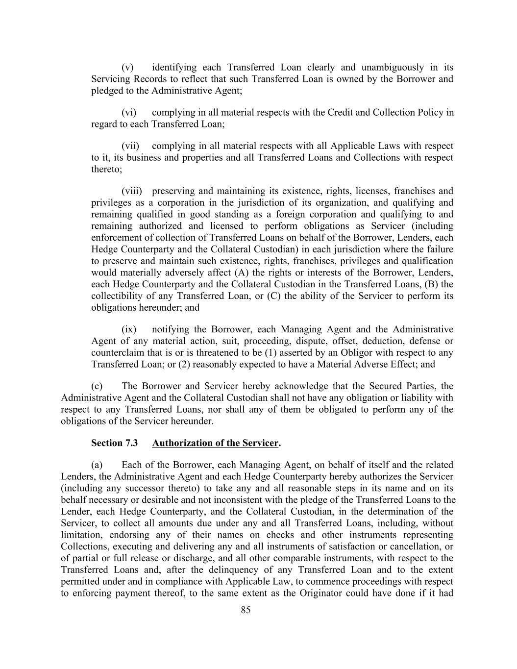 (v) identifying each Transferred Loan clearly and unambiguously in its Servicing Records to reflect that such Transferred Loan is owned by the Borrower and pledged to the Administrative Agent; (vi) complying in all material respects with the Credit and Collection Policy in regard to each Transferred Loan; (vii) complying in all material respects with all Applicable Laws with respect to it, its business and properties and all Transferred Loans and Collections with respect thereto; (viii) preserving and maintaining its existence, rights, licenses, franchises and privileges as a corporation in the jurisdiction of its organization, and qualifying and remaining qualified in good standing as a foreign corporation and qualifying to and remaining authorized and licensed to perform obligations as Servicer (including enforcement of collection of Transferred Loans on behalf of the Borrower, Lenders, each Hedge Counterparty and the Collateral Custodian) in each jurisdiction where the failure to preserve and maintain such existence, rights, franchises, privileges and qualification would materially adversely affect (A) the rights or interests of the Borrower, Lenders, each Hedge Counterparty and the Collateral Custodian in the Transferred Loans, (B) the collectibility of any Transferred Loan, or (C) the ability of the Servicer to perform its obligations hereunder; and (ix) notifying the Borrower, each Managing Agent and the Administrative Agent of any material action, suit, proceeding, dispute, offset, deduction, defense or counterclaim that is or is threatened to be (1) asserted by an Obligor with respect to any Transferred Loan; or (2) reasonably expected to have a Material Adverse Effect; and (c) The Borrower and Servicer hereby acknowledge that the Secured Parties, the Administrative Agent and the Collateral Custodian shall not have any obligation or liability with respect to any Transferred Loans, nor shall any of them be obligated to perform any of the obligations of the Servicer hereunder. Section 7.3 Authorization of the Servicer. (a) Each of the Borrower, each Managing Agent, on behalf of itself and the related Lenders, the Administrative Agent and each Hedge Counterparty hereby authorizes the Servicer (including any successor thereto) to take any and all reasonable steps in its name and on its behalf necessary or desirable and not inconsistent with the pledge of the Transferred Loans to the Lender, each Hedge Counterparty, and the Collateral Custodian, in the determination of the Servicer, to collect all amounts due under any and all Transferred Loans, including, without limitation, endorsing any of their names on checks and other instruments representing Collections, executing and delivering any and all instruments of satisfaction or cancellation, or of partial or full release or discharge, and all other comparable instruments, with respect to the Transferred Loans and, after the delinquency of any Transferred Loan and to the extent permitted under and in compliance with Applicable Law, to commence proceedings with respect to enforcing payment thereof, to the same extent as the Originator could have done if it had 85