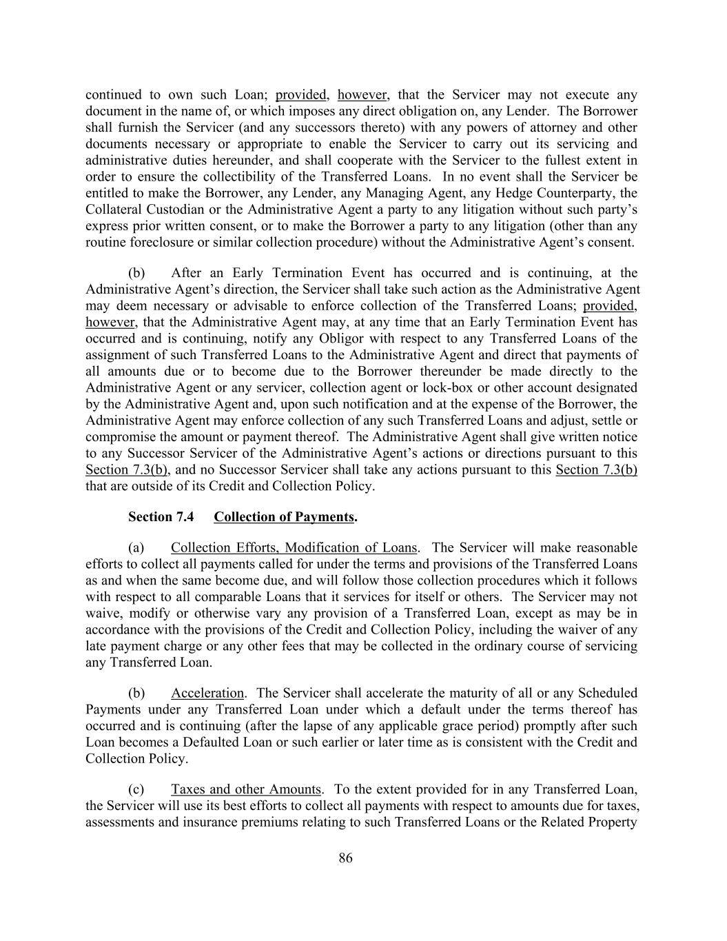 continued to own such Loan; provided, however, that the Servicer may not execute any document in the name of, or which imposes any direct obligation on, any Lender. The Borrower shall furnish the Servicer (and any successors thereto) with any powers of attorney and other documents necessary or appropriate to enable the Servicer to carry out its servicing and administrative duties hereunder, and shall cooperate with the Servicer to the fullest extent in order to ensure the collectibility of the Transferred Loans. In no event shall the Servicer be entitled to make the Borrower, any Lender, any Managing Agent, any Hedge Counterparty, the Collateral Custodian or the Administrative Agent a party to any litigation without such party’s express prior written consent, or to make the Borrower a party to any litigation (other than any routine foreclosure or similar collection procedure) without the Administrative Agent’s consent. (b) After an Early Termination Event has occurred and is continuing, at the Administrative Agent’s direction, the Servicer shall take such action as the Administrative Agent may deem necessary or advisable to enforce collection of the Transferred Loans; provided, however, that the Administrative Agent may, at any time that an Early Termination Event has occurred and is continuing, notify any Obligor with respect to any Transferred Loans of the assignment of such Transferred Loans to the Administrative Agent and direct that payments of all amounts due or to become due to the Borrower thereunder be made directly to the Administrative Agent or any servicer, collection agent or lock-box or other account designated by the Administrative Agent and, upon such notification and at the expense of the Borrower, the Administrative Agent may enforce collection of any such Transferred Loans and adjust, settle or compromise the amount or payment thereof. The Administrative Agent shall give written notice to any Successor Servicer of the Administrative Agent’s actions or directions pursuant to this Section 7.3(b), and no Successor Servicer shall take any actions pursuant to this Section 7.3(b) that are outside of its Credit and Collection Policy. Section 7.4 Collection of Payments. (a) Collection Efforts, Modification of Loans. The Servicer will make reasonable efforts to collect all payments called for under the terms and provisions of the Transferred Loans as and when the same become due, and will follow those collection procedures which it follows with respect to all comparable Loans that it services for itself or others. The Servicer may not waive, modify or otherwise vary any provision of a Transferred Loan, except as may be in accordance with the provisions of the Credit and Collection Policy, including the waiver of any late payment charge or any other fees that may be collected in the ordinary course of servicing any Transferred Loan. (b) Acceleration. The Servicer shall accelerate the maturity of all or any Scheduled Payments under any Transferred Loan under which a default under the terms thereof has occurred and is continuing (after the lapse of any applicable grace period) promptly after such Loan becomes a Defaulted Loan or such earlier or later time as is consistent with the Credit and Collection Policy. (c) Taxes and other Amounts. To the extent provided for in any Transferred Loan, the Servicer will use its best efforts to collect all payments with respect to amounts due for taxes, assessments and insurance premiums relating to such Transferred Loans or the Related Property 86