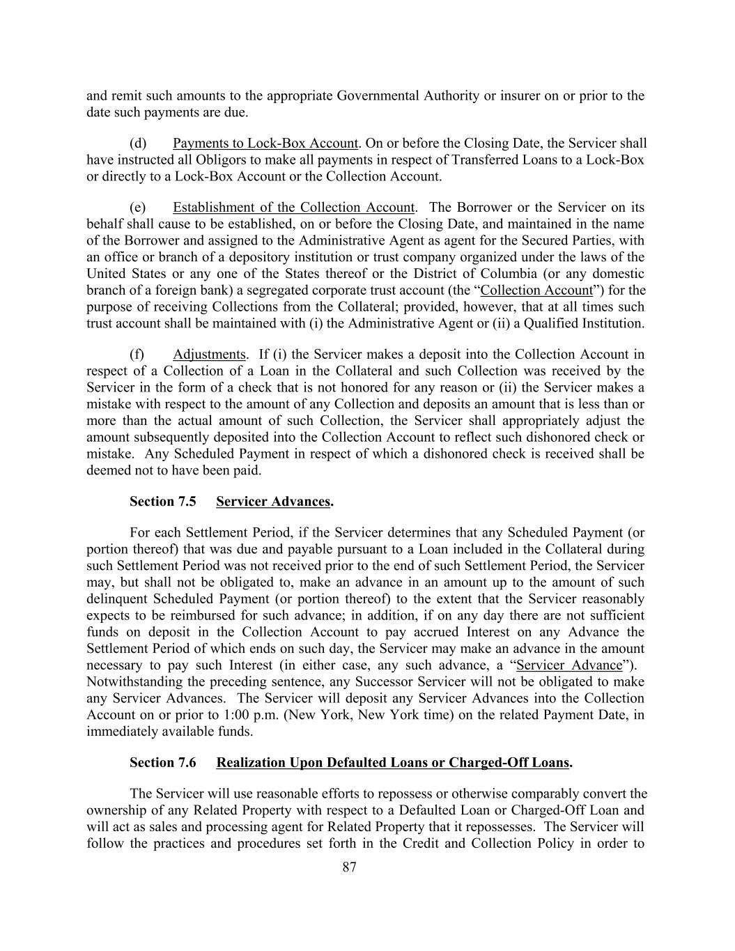 and remit such amounts to the appropriate Governmental Authority or insurer on or prior to the date such payments are due. (d) Payments to Lock-Box Account. On or before the Closing Date, the Servicer shall have instructed all Obligors to make all payments in respect of Transferred Loans to a Lock-Box or directly to a Lock-Box Account or the Collection Account. (e) Establishment of the Collection Account. The Borrower or the Servicer on its behalf shall cause to be established, on or before the Closing Date, and maintained in the name of the Borrower and assigned to the Administrative Agent as agent for the Secured Parties, with an office or branch of a depository institution or trust company organized under the laws of the United States or any one of the States thereof or the District of Columbia (or any domestic branch of a foreign bank) a segregated corporate trust account (the “Collection Account”) for the purpose of receiving Collections from the Collateral; provided, however, that at all times such trust account shall be maintained with (i) the Administrative Agent or (ii) a Qualified Institution. (f) Adjustments. If (i) the Servicer makes a deposit into the Collection Account in respect of a Collection of a Loan in the Collateral and such Collection was received by the Servicer in the form of a check that is not honored for any reason or (ii) the Servicer makes a mistake with respect to the amount of any Collection and deposits an amount that is less than or more than the actual amount of such Collection, the Servicer shall appropriately adjust the amount subsequently deposited into the Collection Account to reflect such dishonored check or mistake. Any Scheduled Payment in respect of which a dishonored check is received shall be deemed not to have been paid. Section 7.5 Servicer Advances. For each Settlement Period, if the Servicer determines that any Scheduled Payment (or portion thereof) that was due and payable pursuant to a Loan included in the Collateral during such Settlement Period was not received prior to the end of such Settlement Period, the Servicer may, but shall not be obligated to, make an advance in an amount up to the amount of such delinquent Scheduled Payment (or portion thereof) to the extent that the Servicer reasonably expects to be reimbursed for such advance; in addition, if on any day there are not sufficient funds on deposit in the Collection Account to pay accrued Interest on any Advance the Settlement Period of which ends on such day, the Servicer may make an advance in the amount necessary to pay such Interest (in either case, any such advance, a “Servicer Advance”). Notwithstanding the preceding sentence, any Successor Servicer will not be obligated to make any Servicer Advances. The Servicer will deposit any Servicer Advances into the Collection Account on or prior to 1:00 p.m. (New York, New York time) on the related Payment Date, in immediately available funds. Section 7.6 Realization Upon Defaulted Loans or Charged-Off Loans. The Servicer will use reasonable efforts to repossess or otherwise comparably convert the ownership of any Related Property with respect to a Defaulted Loan or Charged-Off Loan and will act as sales and processing agent for Related Property that it repossesses. The Servicer will follow the practices and procedures set forth in the Credit and Collection Policy in order to 87