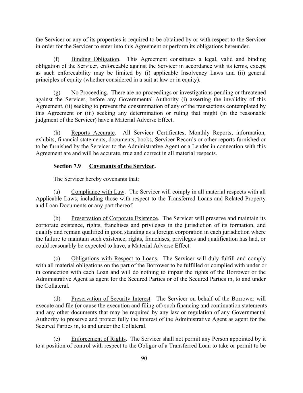 the Servicer or any of its properties is required to be obtained by or with respect to the Servicer in order for the Servicer to enter into this Agreement or perform its obligations hereunder. (f) Binding Obligation. This Agreement constitutes a legal, valid and binding obligation of the Servicer, enforceable against the Servicer in accordance with its terms, except as such enforceability may be limited by (i) applicable Insolvency Laws and (ii) general principles of equity (whether considered in a suit at law or in equity). (g) No Proceeding. There are no proceedings or investigations pending or threatened against the Servicer, before any Governmental Authority (i) asserting the invalidity of this Agreement, (ii) seeking to prevent the consummation of any of the transactions contemplated by this Agreement or (iii) seeking any determination or ruling that might (in the reasonable judgment of the Servicer) have a Material Adverse Effect. (h) Reports Accurate. All Servicer Certificates, Monthly Reports, information, exhibits, financial statements, documents, books, Servicer Records or other reports furnished or to be furnished by the Servicer to the Administrative Agent or a Lender in connection with this Agreement are and will be accurate, true and correct in all material respects. Section 7.9 Covenants of the Servicer. The Servicer hereby covenants that: (a) Compliance with Law. The Servicer will comply in all material respects with all Applicable Laws, including those with respect to the Transferred Loans and Related Property and Loan Documents or any part thereof. (b) Preservation of Corporate Existence. The Servicer will preserve and maintain its corporate existence, rights, franchises and privileges in the jurisdiction of its formation, and qualify and remain qualified in good standing as a foreign corporation in each jurisdiction where the failure to maintain such existence, rights, franchises, privileges and qualification has had, or could reasonably be expected to have, a Material Adverse Effect. (c) Obligations with Respect to Loans. The Servicer will duly fulfill and comply with all material obligations on the part of the Borrower to be fulfilled or complied with under or in connection with each Loan and will do nothing to impair the rights of the Borrower or the Administrative Agent as agent for the Secured Parties or of the Secured Parties in, to and under the Collateral. (d) Preservation of Security Interest. The Servicer on behalf of the Borrower will execute and file (or cause the execution and filing of) such financing and continuation statements and any other documents that may be required by any law or regulation of any Governmental Authority to preserve and protect fully the interest of the Administrative Agent as agent for the Secured Parties in, to and under the Collateral. (e) Enforcement of Rights. The Servicer shall not permit any Person appointed by it to a position of control with respect to the Obligor of a Transferred Loan to take or permit to be 90