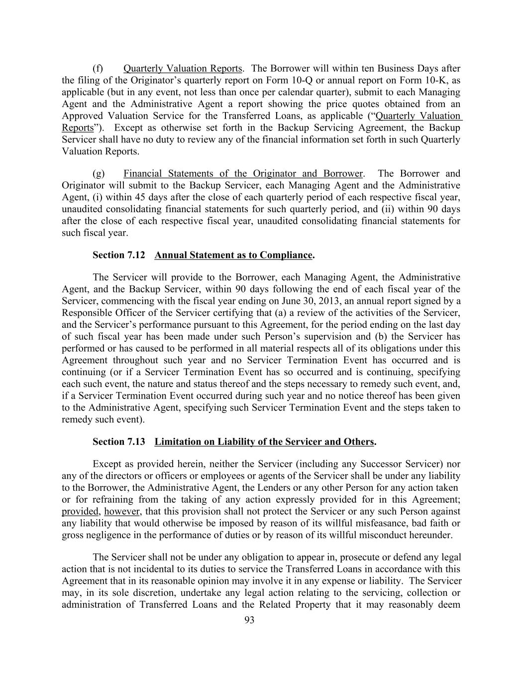 (f) Quarterly Valuation Reports. The Borrower will within ten Business Days after the filing of the Originator’s quarterly report on Form 10-Q or annual report on Form 10-K, as applicable (but in any event, not less than once per calendar quarter), submit to each Managing Agent and the Administrative Agent a report showing the price quotes obtained from an Approved Valuation Service for the Transferred Loans, as applicable (“Quarterly Valuation Reports”). Except as otherwise set forth in the Backup Servicing Agreement, the Backup Servicer shall have no duty to review any of the financial information set forth in such Quarterly Valuation Reports. (g) Financial Statements of the Originator and Borrower. The Borrower and Originator will submit to the Backup Servicer, each Managing Agent and the Administrative Agent, (i) within 45 days after the close of each quarterly period of each respective fiscal year, unaudited consolidating financial statements for such quarterly period, and (ii) within 90 days after the close of each respective fiscal year, unaudited consolidating financial statements for such fiscal year. Section 7.12 Annual Statement as to Compliance. The Servicer will provide to the Borrower, each Managing Agent, the Administrative Agent, and the Backup Servicer, within 90 days following the end of each fiscal year of the Servicer, commencing with the fiscal year ending on June 30, 2013, an annual report signed by a Responsible Officer of the Servicer certifying that (a) a review of the activities of the Servicer, and the Servicer’s performance pursuant to this Agreement, for the period ending on the last day of such fiscal year has been made under such Person’s supervision and (b) the Servicer has performed or has caused to be performed in all material respects all of its obligations under this Agreement throughout such year and no Servicer Termination Event has occurred and is continuing (or if a Servicer Termination Event has so occurred and is continuing, specifying each such event, the nature and status thereof and the steps necessary to remedy such event, and, if a Servicer Termination Event occurred during such year and no notice thereof has been given to the Administrative Agent, specifying such Servicer Termination Event and the steps taken to remedy such event). Section 7.13 Limitation on Liability of the Servicer and Others. Except as provided herein, neither the Servicer (including any Successor Servicer) nor any of the directors or officers or employees or agents of the Servicer shall be under any liability to the Borrower, the Administrative Agent, the Lenders or any other Person for any action taken or for refraining from the taking of any action expressly provided for in this Agreement; provided, however, that this provision shall not protect the Servicer or any such Person against any liability that would otherwise be imposed by reason of its willful misfeasance, bad faith or gross negligence in the performance of duties or by reason of its willful misconduct hereunder. The Servicer shall not be under any obligation to appear in, prosecute or defend any legal action that is not incidental to its duties to service the Transferred Loans in accordance with this Agreement that in its reasonable opinion may involve it in any expense or liability. The Servicer may, in its sole discretion, undertake any legal action relating to the servicing, collection or administration of Transferred Loans and the Related Property that it may reasonably deem 93