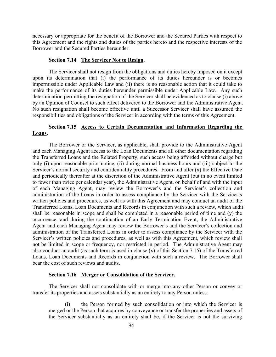 necessary or appropriate for the benefit of the Borrower and the Secured Parties with respect to this Agreement and the rights and duties of the parties hereto and the respective interests of the Borrower and the Secured Parties hereunder. Section 7.14 The Servicer Not to Resign. The Servicer shall not resign from the obligations and duties hereby imposed on it except upon its determination that (i) the performance of its duties hereunder is or becomes impermissible under Applicable Law and (ii) there is no reasonable action that it could take to make the performance of its duties hereunder permissible under Applicable Law. Any such determination permitting the resignation of the Servicer shall be evidenced as to clause (i) above by an Opinion of Counsel to such effect delivered to the Borrower and the Administrative Agent. No such resignation shall become effective until a Successor Servicer shall have assumed the responsibilities and obligations of the Servicer in according with the terms of this Agreement. Section 7.15 Access to Certain Documentation and Information Regarding the Loans. The Borrower or the Servicer, as applicable, shall provide to the Administrative Agent and each Managing Agent access to the Loan Documents and all other documentation regarding the Transferred Loans and the Related Property, such access being afforded without charge but only (i) upon reasonable prior notice, (ii) during normal business hours and (iii) subject to the Servicer’s normal security and confidentiality procedures. From and after (x) the Effective Date and periodically thereafter at the discretion of the Administrative Agent (but in no event limited to fewer than twice per calendar year), the Administrative Agent, on behalf of and with the input of each Managing Agent, may review the Borrower’s and the Servicer’s collection and administration of the Loans in order to assess compliance by the Servicer with the Servicer’s written policies and procedures, as well as with this Agreement and may conduct an audit of the Transferred Loans, Loan Documents and Records in conjunction with such a review, which audit shall be reasonable in scope and shall be completed in a reasonable period of time and (y) the occurrence, and during the continuation of an Early Termination Event, the Administrative Agent and each Managing Agent may review the Borrower’s and the Servicer’s collection and administration of the Transferred Loans in order to assess compliance by the Servicer with the Servicer’s written policies and procedures, as well as with this Agreement, which review shall not be limited in scope or frequency, nor restricted in period. The Administrative Agent may also conduct an audit (as such term is used in clause (x) of this Section 7.15) of the Transferred Loans, Loan Documents and Records in conjunction with such a review. The Borrower shall bear the cost of such reviews and audits. Section 7.16 Merger or Consolidation of the Servicer. The Servicer shall not consolidate with or merge into any other Person or convey or transfer its properties and assets substantially as an entirety to any Person unless: (i) the Person formed by such consolidation or into which the Servicer is merged or the Person that acquires by conveyance or transfer the properties and assets of the Servicer substantially as an entirety shall be, if the Servicer is not the surviving 94