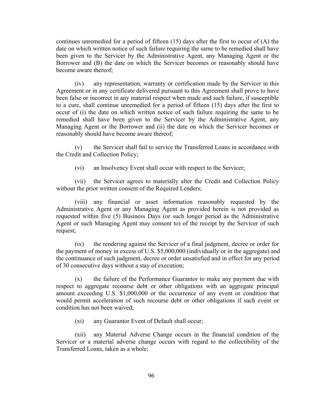 continues unremedied for a period of fifteen (15) days after the first to occur of (A) the date on which written notice of such failure requiring the same to be remedied shall have been given to the Servicer by the Administrative Agent, any Managing Agent or the Borrower and (B) the date on which the Servicer becomes or reasonably should have become aware thereof; (iv) any representation, warranty or certification made by the Servicer in this Agreement or in any certificate delivered pursuant to this Agreement shall prove to have been false or incorrect in any material respect when made and such failure, if susceptible to a cure, shall continue unremedied for a period of fifteen (15) days after the first to occur of (i) the date on which written notice of such failure requiring the same to be remedied shall have been given to the Servicer by the Administrative Agent, any Managing Agent or the Borrower and (ii) the date on which the Servicer becomes or reasonably should have become aware thereof; (v) the Servicer shall fail to service the Transferred Loans in accordance with the Credit and Collection Policy; (vi) an Insolvency Event shall occur with respect to the Servicer; (vii) the Servicer agrees to materially alter the Credit and Collection Policy without the prior written consent of the Required Lenders; (viii) any financial or asset information reasonably requested by the Administrative Agent or any Managing Agent as provided herein is not provided as requested within five (5) Business Days (or such longer period as the Administrative Agent or such Managing Agent may consent to) of the receipt by the Servicer of such request; (ix) the rendering against the Servicer of a final judgment, decree or order for the payment of money in excess of U.S. $5,000,000 (individually or in the aggregate) and the continuance of such judgment, decree or order unsatisfied and in effect for any period of 30 consecutive days without a stay of execution; (x) the failure of the Performance Guarantor to make any payment due with respect to aggregate recourse debt or other obligations with an aggregate principal amount exceeding U.S. $1,000,000 or the occurrence of any event or condition that would permit acceleration of such recourse debt or other obligations if such event or condition has not been waived; (xi) any Guarantor Event of Default shall occur; (xii) any Material Adverse Change occurs in the financial condition of the Servicer or a material adverse change occurs with regard to the collectibility of the Transferred Loans, taken as a whole; 96