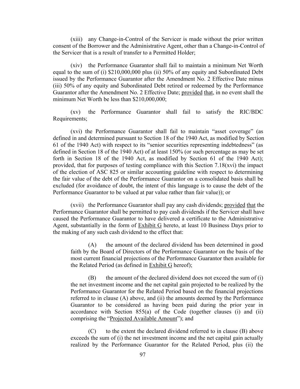 (xiii) any Change-in-Control of the Servicer is made without the prior written consent of the Borrower and the Administrative Agent, other than a Change-in-Control of the Servicer that is a result of transfer to a Permitted Holder; (xiv) the Performance Guarantor shall fail to maintain a minimum Net Worth equal to the sum of (i) $210,000,000 plus (ii) 50% of any equity and Subordinated Debt issued by the Performance Guarantor after the Amendment No. 2 Effective Date minus (iii) 50% of any equity and Subordinated Debt retired or redeemed by the Performance Guarantor after the Amendment No. 2 Effective Date; provided that, in no event shall the minimum Net Worth be less than $210,000,000; (xv) the Performance Guarantor shall fail to satisfy the RIC/BDC Requirements; (xvi) the Performance Guarantor shall fail to maintain “asset coverage” (as defined in and determined pursuant to Section 18 of the 1940 Act, as modified by Section 61 of the 1940 Act) with respect to its “senior securities representing indebtedness” (as defined in Section 18 of the 1940 Act) of at least 150% (or such percentage as may be set forth in Section 18 of the 1940 Act, as modified by Section 61 of the 1940 Act); provided, that for purposes of testing compliance with this Section 7.18(xvi) the impact of the election of ASC 825 or similar accounting guideline with respect to determining the fair value of the debt of the Performance Guarantor on a consolidated basis shall be excluded (for avoidance of doubt, the intent of this language is to cause the debt of the Performance Guarantor to be valued at par value rather than fair value)); or (xvii) the Performance Guarantor shall pay any cash dividends; provided that the Performance Guarantor shall be permitted to pay cash dividends if the Servicer shall have caused the Performance Guarantor to have delivered a certificate to the Administrative Agent, substantially in the form of Exhibit G hereto, at least 10 Business Days prior to the making of any such cash dividend to the effect that: (A) the amount of the declared dividend has been determined in good faith by the Board of Directors of the Performance Guarantor on the basis of the most current financial projections of the Performance Guarantor then available for the Related Period (as defined in Exhibit G hereof); (B) the amount of the declared dividend does not exceed the sum of (i) the net investment income and the net capital gain projected to be realized by the Performance Guarantor for the Related Period based on the financial projections referred to in clause (A) above, and (ii) the amounts deemed by the Performance Guarantor to be considered as having been paid during the prior year in accordance with Section 855(a) of the Code (together clauses (i) and (ii) comprising the “Projected Available Amount”); and (C) to the extent the declared dividend referred to in clause (B) above exceeds the sum of (i) the net investment income and the net capital gain actually realized by the Performance Guarantor for the Related Period, plus (ii) the 97