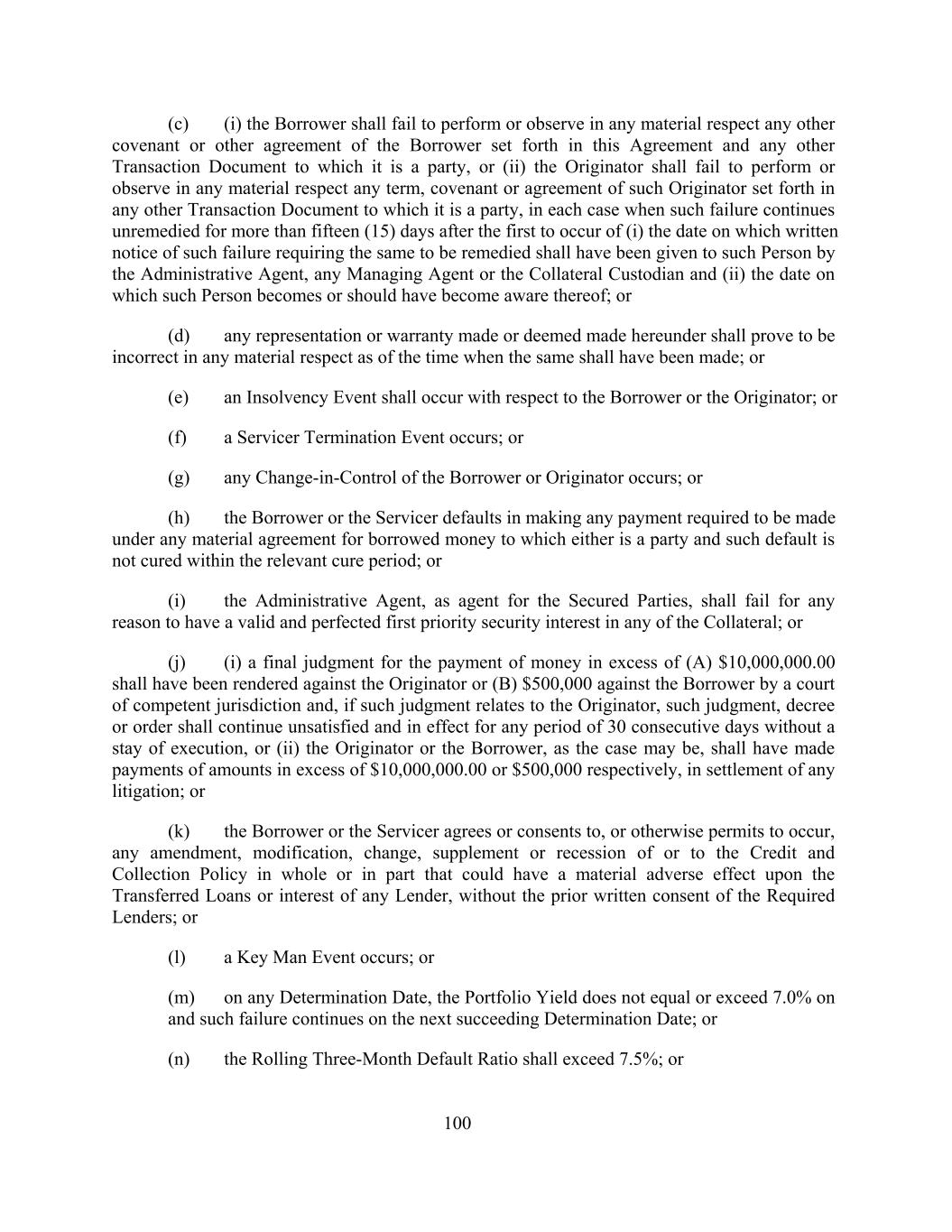 (c) (i) the Borrower shall fail to perform or observe in any material respect any other covenant or other agreement of the Borrower set forth in this Agreement and any other Transaction Document to which it is a party, or (ii) the Originator shall fail to perform or observe in any material respect any term, covenant or agreement of such Originator set forth in any other Transaction Document to which it is a party, in each case when such failure continues unremedied for more than fifteen (15) days after the first to occur of (i) the date on which written notice of such failure requiring the same to be remedied shall have been given to such Person by the Administrative Agent, any Managing Agent or the Collateral Custodian and (ii) the date on which such Person becomes or should have become aware thereof; or (d) any representation or warranty made or deemed made hereunder shall prove to be incorrect in any material respect as of the time when the same shall have been made; or (e) an Insolvency Event shall occur with respect to the Borrower or the Originator; or (f) a Servicer Termination Event occurs; or (g) any Change-in-Control of the Borrower or Originator occurs; or (h) the Borrower or the Servicer defaults in making any payment required to be made under any material agreement for borrowed money to which either is a party and such default is not cured within the relevant cure period; or (i) the Administrative Agent, as agent for the Secured Parties, shall fail for any reason to have a valid and perfected first priority security interest in any of the Collateral; or (j) (i) a final judgment for the payment of money in excess of (A) $10,000,000.00 shall have been rendered against the Originator or (B) $500,000 against the Borrower by a court of competent jurisdiction and, if such judgment relates to the Originator, such judgment, decree or order shall continue unsatisfied and in effect for any period of 30 consecutive days without a stay of execution, or (ii) the Originator or the Borrower, as the case may be, shall have made payments of amounts in excess of $10,000,000.00 or $500,000 respectively, in settlement of any litigation; or (k) the Borrower or the Servicer agrees or consents to, or otherwise permits to occur, any amendment, modification, change, supplement or recession of or to the Credit and Collection Policy in whole or in part that could have a material adverse effect upon the Transferred Loans or interest of any Lender, without the prior written consent of the Required Lenders; or (l) a Key Man Event occurs; or (m) on any Determination Date, the Portfolio Yield does not equal or exceed 7.0% on and such failure continues on the next succeeding Determination Date; or (n) the Rolling Three-Month Default Ratio shall exceed 7.5%; or 100
