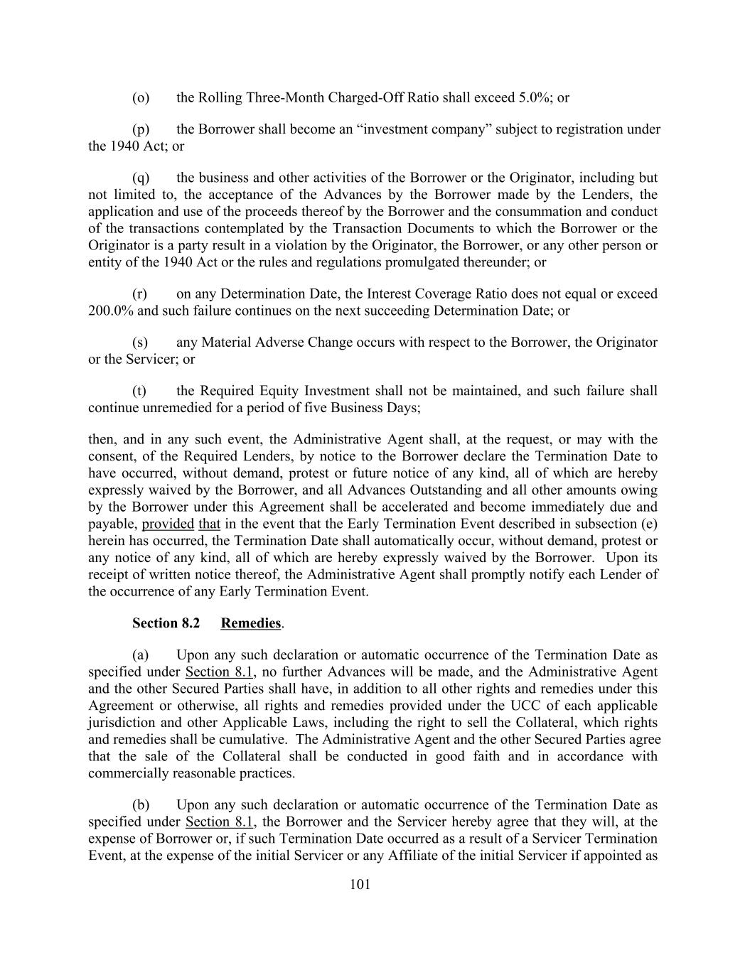 (o) the Rolling Three-Month Charged-Off Ratio shall exceed 5.0%; or (p) the Borrower shall become an “investment company” subject to registration under the 1940 Act; or (q) the business and other activities of the Borrower or the Originator, including but not limited to, the acceptance of the Advances by the Borrower made by the Lenders, the application and use of the proceeds thereof by the Borrower and the consummation and conduct of the transactions contemplated by the Transaction Documents to which the Borrower or the Originator is a party result in a violation by the Originator, the Borrower, or any other person or entity of the 1940 Act or the rules and regulations promulgated thereunder; or (r) on any Determination Date, the Interest Coverage Ratio does not equal or exceed 200.0% and such failure continues on the next succeeding Determination Date; or (s) any Material Adverse Change occurs with respect to the Borrower, the Originator or the Servicer; or (t) the Required Equity Investment shall not be maintained, and such failure shall continue unremedied for a period of five Business Days; then, and in any such event, the Administrative Agent shall, at the request, or may with the consent, of the Required Lenders, by notice to the Borrower declare the Termination Date to have occurred, without demand, protest or future notice of any kind, all of which are hereby expressly waived by the Borrower, and all Advances Outstanding and all other amounts owing by the Borrower under this Agreement shall be accelerated and become immediately due and payable, provided that in the event that the Early Termination Event described in subsection (e) herein has occurred, the Termination Date shall automatically occur, without demand, protest or any notice of any kind, all of which are hereby expressly waived by the Borrower. Upon its receipt of written notice thereof, the Administrative Agent shall promptly notify each Lender of the occurrence of any Early Termination Event. Section 8.2 Remedies. (a) Upon any such declaration or automatic occurrence of the Termination Date as specified under Section 8.1, no further Advances will be made, and the Administrative Agent and the other Secured Parties shall have, in addition to all other rights and remedies under this Agreement or otherwise, all rights and remedies provided under the UCC of each applicable jurisdiction and other Applicable Laws, including the right to sell the Collateral, which rights and remedies shall be cumulative. The Administrative Agent and the other Secured Parties agree that the sale of the Collateral shall be conducted in good faith and in accordance with commercially reasonable practices. (b) Upon any such declaration or automatic occurrence of the Termination Date as specified under Section 8.1, the Borrower and the Servicer hereby agree that they will, at the expense of Borrower or, if such Termination Date occurred as a result of a Servicer Termination Event, at the expense of the initial Servicer or any Affiliate of the initial Servicer if appointed as 101