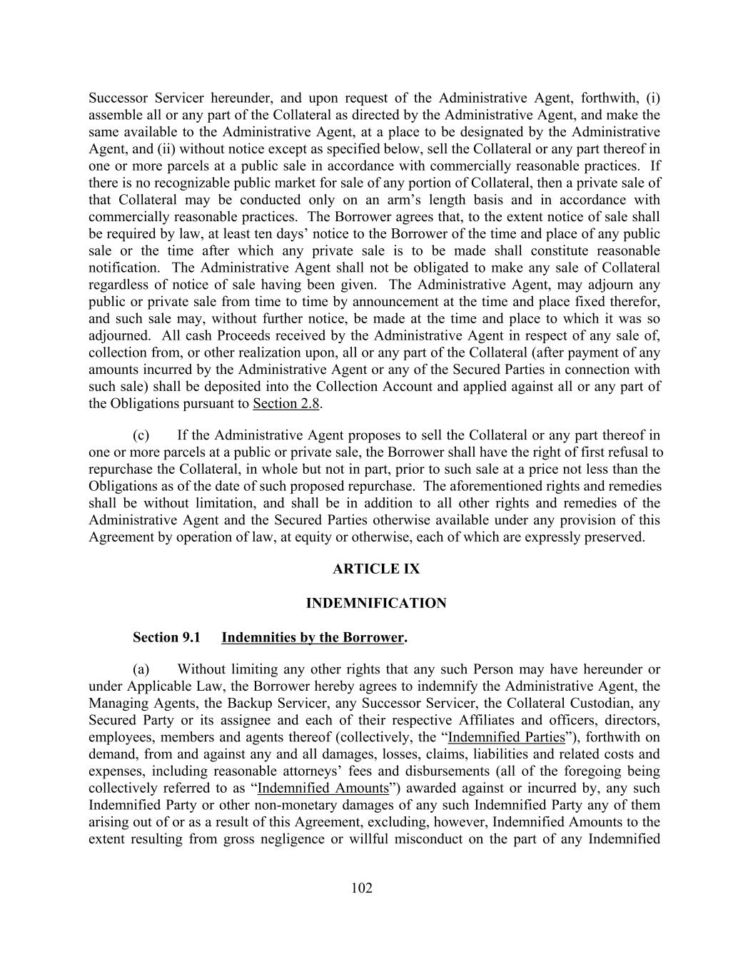 Successor Servicer hereunder, and upon request of the Administrative Agent, forthwith, (i) assemble all or any part of the Collateral as directed by the Administrative Agent, and make the same available to the Administrative Agent, at a place to be designated by the Administrative Agent, and (ii) without notice except as specified below, sell the Collateral or any part thereof in one or more parcels at a public sale in accordance with commercially reasonable practices. If there is no recognizable public market for sale of any portion of Collateral, then a private sale of that Collateral may be conducted only on an arm’s length basis and in accordance with commercially reasonable practices. The Borrower agrees that, to the extent notice of sale shall be required by law, at least ten days’ notice to the Borrower of the time and place of any public sale or the time after which any private sale is to be made shall constitute reasonable notification. The Administrative Agent shall not be obligated to make any sale of Collateral regardless of notice of sale having been given. The Administrative Agent, may adjourn any public or private sale from time to time by announcement at the time and place fixed therefor, and such sale may, without further notice, be made at the time and place to which it was so adjourned. All cash Proceeds received by the Administrative Agent in respect of any sale of, collection from, or other realization upon, all or any part of the Collateral (after payment of any amounts incurred by the Administrative Agent or any of the Secured Parties in connection with such sale) shall be deposited into the Collection Account and applied against all or any part of the Obligations pursuant to Section 2.8. (c) If the Administrative Agent proposes to sell the Collateral or any part thereof in one or more parcels at a public or private sale, the Borrower shall have the right of first refusal to repurchase the Collateral, in whole but not in part, prior to such sale at a price not less than the Obligations as of the date of such proposed repurchase. The aforementioned rights and remedies shall be without limitation, and shall be in addition to all other rights and remedies of the Administrative Agent and the Secured Parties otherwise available under any provision of this Agreement by operation of law, at equity or otherwise, each of which are expressly preserved. ARTICLE IX INDEMNIFICATION Section 9.1 Indemnities by the Borrower. (a) Without limiting any other rights that any such Person may have hereunder or under Applicable Law, the Borrower hereby agrees to indemnify the Administrative Agent, the Managing Agents, the Backup Servicer, any Successor Servicer, the Collateral Custodian, any Secured Party or its assignee and each of their respective Affiliates and officers, directors, employees, members and agents thereof (collectively, the “Indemnified Parties”), forthwith on demand, from and against any and all damages, losses, claims, liabilities and related costs and expenses, including reasonable attorneys’ fees and disbursements (all of the foregoing being collectively referred to as “Indemnified Amounts”) awarded against or incurred by, any such Indemnified Party or other non-monetary damages of any such Indemnified Party any of them arising out of or as a result of this Agreement, excluding, however, Indemnified Amounts to the extent resulting from gross negligence or willful misconduct on the part of any Indemnified 102