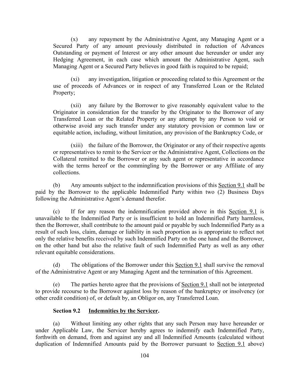 (x) any repayment by the Administrative Agent, any Managing Agent or a Secured Party of any amount previously distributed in reduction of Advances Outstanding or payment of Interest or any other amount due hereunder or under any Hedging Agreement, in each case which amount the Administrative Agent, such Managing Agent or a Secured Party believes in good faith is required to be repaid; (xi) any investigation, litigation or proceeding related to this Agreement or the use of proceeds of Advances or in respect of any Transferred Loan or the Related Property; (xii) any failure by the Borrower to give reasonably equivalent value to the Originator in consideration for the transfer by the Originator to the Borrower of any Transferred Loan or the Related Property or any attempt by any Person to void or otherwise avoid any such transfer under any statutory provision or common law or equitable action, including, without limitation, any provision of the Bankruptcy Code, or (xiii) the failure of the Borrower, the Originator or any of their respective agents or representatives to remit to the Servicer or the Administrative Agent, Collections on the Collateral remitted to the Borrower or any such agent or representative in accordance with the terms hereof or the commingling by the Borrower or any Affiliate of any collections. (b) Any amounts subject to the indemnification provisions of this Section 9.1 shall be paid by the Borrower to the applicable Indemnified Party within two (2) Business Days following the Administrative Agent’s demand therefor. (c) If for any reason the indemnification provided above in this Section 9.1 is unavailable to the Indemnified Party or is insufficient to hold an Indemnified Party harmless, then the Borrower, shall contribute to the amount paid or payable by such Indemnified Party as a result of such loss, claim, damage or liability in such proportion as is appropriate to reflect not only the relative benefits received by such Indemnified Party on the one hand and the Borrower, on the other hand but also the relative fault of such Indemnified Party as well as any other relevant equitable considerations. (d) The obligations of the Borrower under this Section 9.1 shall survive the removal of the Administrative Agent or any Managing Agent and the termination of this Agreement. (e) The parties hereto agree that the provisions of Section 9.1 shall not be interpreted to provide recourse to the Borrower against loss by reason of the bankruptcy or insolvency (or other credit condition) of, or default by, an Obligor on, any Transferred Loan. Section 9.2 Indemnities by the Servicer. (a) Without limiting any other rights that any such Person may have hereunder or under Applicable Law, the Servicer hereby agrees to indemnify each Indemnified Party, forthwith on demand, from and against any and all Indemnified Amounts (calculated without duplication of Indemnified Amounts paid by the Borrower pursuant to Section 9.1 above) 104