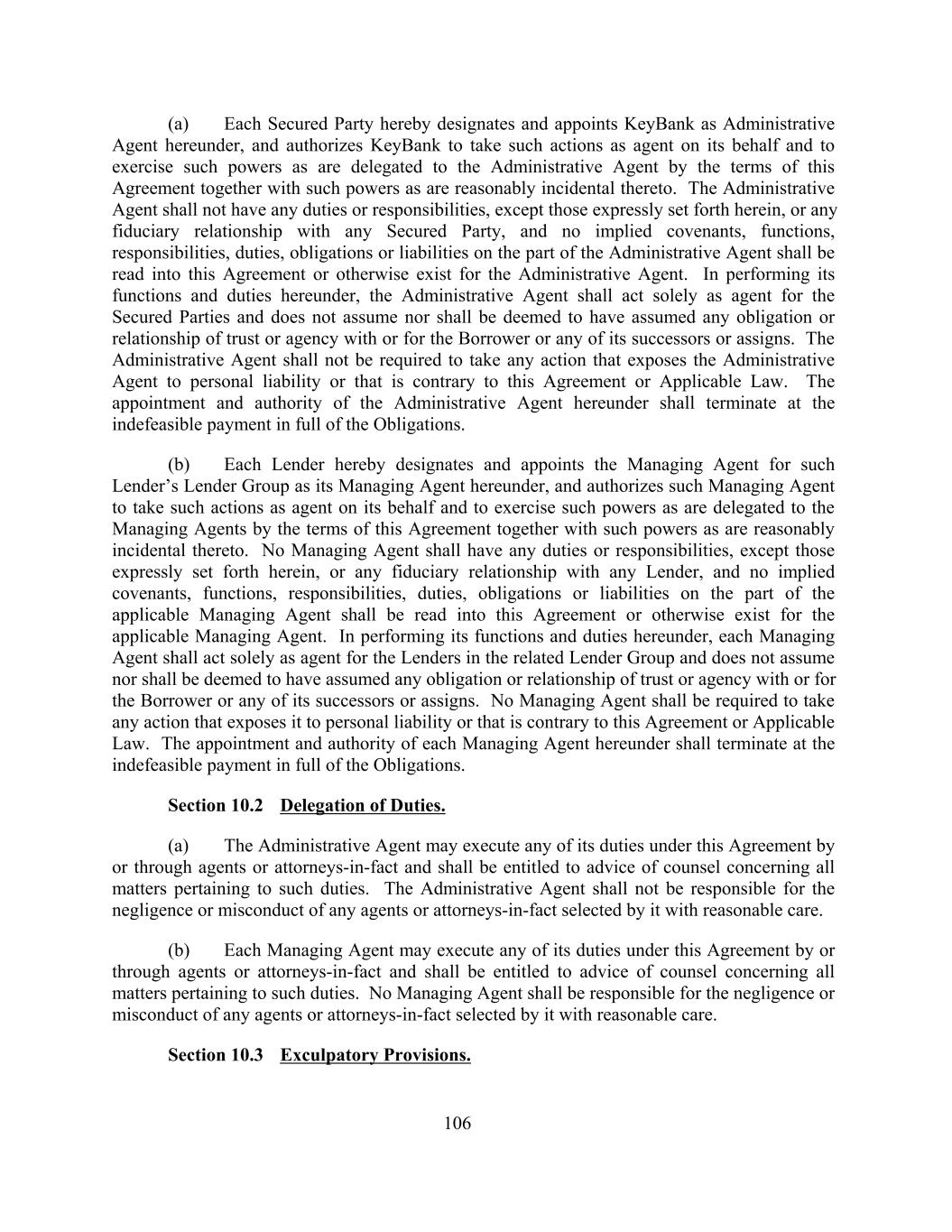 (a) Each Secured Party hereby designates and appoints KeyBank as Administrative Agent hereunder, and authorizes KeyBank to take such actions as agent on its behalf and to exercise such powers as are delegated to the Administrative Agent by the terms of this Agreement together with such powers as are reasonably incidental thereto. The Administrative Agent shall not have any duties or responsibilities, except those expressly set forth herein, or any fiduciary relationship with any Secured Party, and no implied covenants, functions, responsibilities, duties, obligations or liabilities on the part of the Administrative Agent shall be read into this Agreement or otherwise exist for the Administrative Agent. In performing its functions and duties hereunder, the Administrative Agent shall act solely as agent for the Secured Parties and does not assume nor shall be deemed to have assumed any obligation or relationship of trust or agency with or for the Borrower or any of its successors or assigns. The Administrative Agent shall not be required to take any action that exposes the Administrative Agent to personal liability or that is contrary to this Agreement or Applicable Law. The appointment and authority of the Administrative Agent hereunder shall terminate at the indefeasible payment in full of the Obligations. (b) Each Lender hereby designates and appoints the Managing Agent for such Lender’s Lender Group as its Managing Agent hereunder, and authorizes such Managing Agent to take such actions as agent on its behalf and to exercise such powers as are delegated to the Managing Agents by the terms of this Agreement together with such powers as are reasonably incidental thereto. No Managing Agent shall have any duties or responsibilities, except those expressly set forth herein, or any fiduciary relationship with any Lender, and no implied covenants, functions, responsibilities, duties, obligations or liabilities on the part of the applicable Managing Agent shall be read into this Agreement or otherwise exist for the applicable Managing Agent. In performing its functions and duties hereunder, each Managing Agent shall act solely as agent for the Lenders in the related Lender Group and does not assume nor shall be deemed to have assumed any obligation or relationship of trust or agency with or for the Borrower or any of its successors or assigns. No Managing Agent shall be required to take any action that exposes it to personal liability or that is contrary to this Agreement or Applicable Law. The appointment and authority of each Managing Agent hereunder shall terminate at the indefeasible payment in full of the Obligations. Section 10.2 Delegation of Duties. (a) The Administrative Agent may execute any of its duties under this Agreement by or through agents or attorneys-in-fact and shall be entitled to advice of counsel concerning all matters pertaining to such duties. The Administrative Agent shall not be responsible for the negligence or misconduct of any agents or attorneys-in-fact selected by it with reasonable care. (b) Each Managing Agent may execute any of its duties under this Agreement by or through agents or attorneys-in-fact and shall be entitled to advice of counsel concerning all matters pertaining to such duties. No Managing Agent shall be responsible for the negligence or misconduct of any agents or attorneys-in-fact selected by it with reasonable care. Section 10.3 Exculpatory Provisions. 106