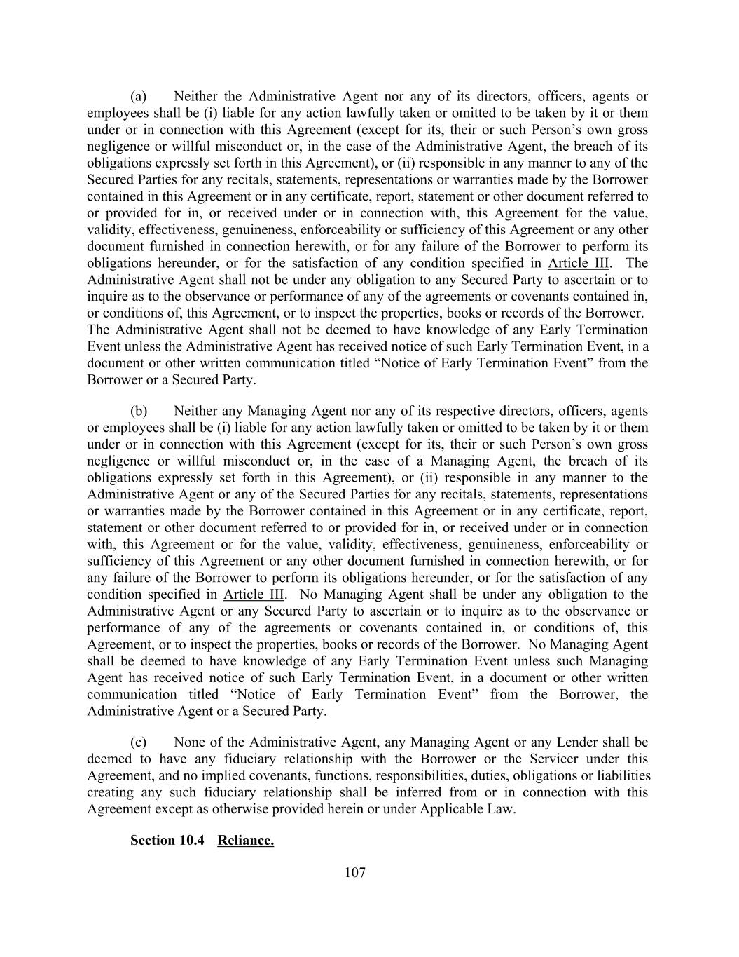 (a) Neither the Administrative Agent nor any of its directors, officers, agents or employees shall be (i) liable for any action lawfully taken or omitted to be taken by it or them under or in connection with this Agreement (except for its, their or such Person’s own gross negligence or willful misconduct or, in the case of the Administrative Agent, the breach of its obligations expressly set forth in this Agreement), or (ii) responsible in any manner to any of the Secured Parties for any recitals, statements, representations or warranties made by the Borrower contained in this Agreement or in any certificate, report, statement or other document referred to or provided for in, or received under or in connection with, this Agreement for the value, validity, effectiveness, genuineness, enforceability or sufficiency of this Agreement or any other document furnished in connection herewith, or for any failure of the Borrower to perform its obligations hereunder, or for the satisfaction of any condition specified in Article III. The Administrative Agent shall not be under any obligation to any Secured Party to ascertain or to inquire as to the observance or performance of any of the agreements or covenants contained in, or conditions of, this Agreement, or to inspect the properties, books or records of the Borrower. The Administrative Agent shall not be deemed to have knowledge of any Early Termination Event unless the Administrative Agent has received notice of such Early Termination Event, in a document or other written communication titled “Notice of Early Termination Event” from the Borrower or a Secured Party. (b) Neither any Managing Agent nor any of its respective directors, officers, agents or employees shall be (i) liable for any action lawfully taken or omitted to be taken by it or them under or in connection with this Agreement (except for its, their or such Person’s own gross negligence or willful misconduct or, in the case of a Managing Agent, the breach of its obligations expressly set forth in this Agreement), or (ii) responsible in any manner to the Administrative Agent or any of the Secured Parties for any recitals, statements, representations or warranties made by the Borrower contained in this Agreement or in any certificate, report, statement or other document referred to or provided for in, or received under or in connection with, this Agreement or for the value, validity, effectiveness, genuineness, enforceability or sufficiency of this Agreement or any other document furnished in connection herewith, or for any failure of the Borrower to perform its obligations hereunder, or for the satisfaction of any condition specified in Article III. No Managing Agent shall be under any obligation to the Administrative Agent or any Secured Party to ascertain or to inquire as to the observance or performance of any of the agreements or covenants contained in, or conditions of, this Agreement, or to inspect the properties, books or records of the Borrower. No Managing Agent shall be deemed to have knowledge of any Early Termination Event unless such Managing Agent has received notice of such Early Termination Event, in a document or other written communication titled “Notice of Early Termination Event” from the Borrower, the Administrative Agent or a Secured Party. (c) None of the Administrative Agent, any Managing Agent or any Lender shall be deemed to have any fiduciary relationship with the Borrower or the Servicer under this Agreement, and no implied covenants, functions, responsibilities, duties, obligations or liabilities creating any such fiduciary relationship shall be inferred from or in connection with this Agreement except as otherwise provided herein or under Applicable Law. Section 10.4 Reliance. 107