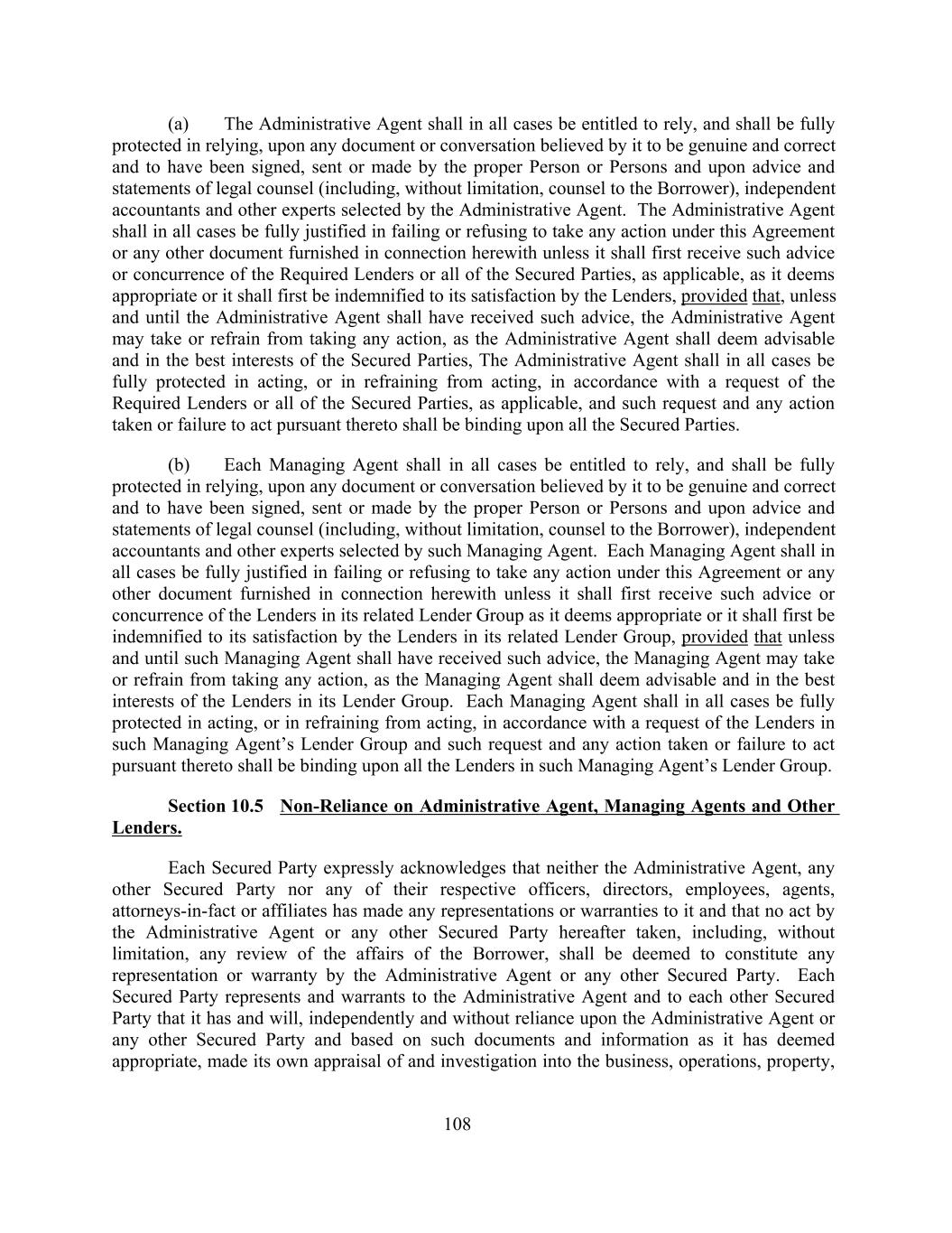 (a) The Administrative Agent shall in all cases be entitled to rely, and shall be fully protected in relying, upon any document or conversation believed by it to be genuine and correct and to have been signed, sent or made by the proper Person or Persons and upon advice and statements of legal counsel (including, without limitation, counsel to the Borrower), independent accountants and other experts selected by the Administrative Agent. The Administrative Agent shall in all cases be fully justified in failing or refusing to take any action under this Agreement or any other document furnished in connection herewith unless it shall first receive such advice or concurrence of the Required Lenders or all of the Secured Parties, as applicable, as it deems appropriate or it shall first be indemnified to its satisfaction by the Lenders, provided that, unless and until the Administrative Agent shall have received such advice, the Administrative Agent may take or refrain from taking any action, as the Administrative Agent shall deem advisable and in the best interests of the Secured Parties, The Administrative Agent shall in all cases be fully protected in acting, or in refraining from acting, in accordance with a request of the Required Lenders or all of the Secured Parties, as applicable, and such request and any action taken or failure to act pursuant thereto shall be binding upon all the Secured Parties. (b) Each Managing Agent shall in all cases be entitled to rely, and shall be fully protected in relying, upon any document or conversation believed by it to be genuine and correct and to have been signed, sent or made by the proper Person or Persons and upon advice and statements of legal counsel (including, without limitation, counsel to the Borrower), independent accountants and other experts selected by such Managing Agent. Each Managing Agent shall in all cases be fully justified in failing or refusing to take any action under this Agreement or any other document furnished in connection herewith unless it shall first receive such advice or concurrence of the Lenders in its related Lender Group as it deems appropriate or it shall first be indemnified to its satisfaction by the Lenders in its related Lender Group, provided that unless and until such Managing Agent shall have received such advice, the Managing Agent may take or refrain from taking any action, as the Managing Agent shall deem advisable and in the best interests of the Lenders in its Lender Group. Each Managing Agent shall in all cases be fully protected in acting, or in refraining from acting, in accordance with a request of the Lenders in such Managing Agent’s Lender Group and such request and any action taken or failure to act pursuant thereto shall be binding upon all the Lenders in such Managing Agent’s Lender Group. Section 10.5 Non-Reliance on Administrative Agent, Managing Agents and Other Lenders. Each Secured Party expressly acknowledges that neither the Administrative Agent, any other Secured Party nor any of their respective officers, directors, employees, agents, attorneys-in-fact or affiliates has made any representations or warranties to it and that no act by the Administrative Agent or any other Secured Party hereafter taken, including, without limitation, any review of the affairs of the Borrower, shall be deemed to constitute any representation or warranty by the Administrative Agent or any other Secured Party. Each Secured Party represents and warrants to the Administrative Agent and to each other Secured Party that it has and will, independently and without reliance upon the Administrative Agent or any other Secured Party and based on such documents and information as it has deemed appropriate, made its own appraisal of and investigation into the business, operations, property, 108