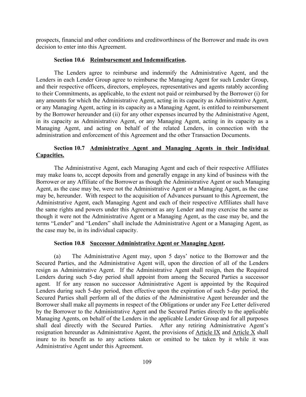 prospects, financial and other conditions and creditworthiness of the Borrower and made its own decision to enter into this Agreement. Section 10.6 Reimbursement and Indemnification. The Lenders agree to reimburse and indemnify the Administrative Agent, and the Lenders in each Lender Group agree to reimburse the Managing Agent for such Lender Group, and their respective officers, directors, employees, representatives and agents ratably according to their Commitments, as applicable, to the extent not paid or reimbursed by the Borrower (i) for any amounts for which the Administrative Agent, acting in its capacity as Administrative Agent, or any Managing Agent, acting in its capacity as a Managing Agent, is entitled to reimbursement by the Borrower hereunder and (ii) for any other expenses incurred by the Administrative Agent, in its capacity as Administrative Agent, or any Managing Agent, acting in its capacity as a Managing Agent, and acting on behalf of the related Lenders, in connection with the administration and enforcement of this Agreement and the other Transaction Documents. Section 10.7 Administrative Agent and Managing Agents in their Individual Capacities. The Administrative Agent, each Managing Agent and each of their respective Affiliates may make loans to, accept deposits from and generally engage in any kind of business with the Borrower or any Affiliate of the Borrower as though the Administrative Agent or such Managing Agent, as the case may be, were not the Administrative Agent or a Managing Agent, as the case may be, hereunder. With respect to the acquisition of Advances pursuant to this Agreement, the Administrative Agent, each Managing Agent and each of their respective Affiliates shall have the same rights and powers under this Agreement as any Lender and may exercise the same as though it were not the Administrative Agent or a Managing Agent, as the case may be, and the terms “Lender” and “Lenders” shall include the Administrative Agent or a Managing Agent, as the case may be, in its individual capacity. Section 10.8 Successor Administrative Agent or Managing Agent. (a) The Administrative Agent may, upon 5 days’ notice to the Borrower and the Secured Parties, and the Administrative Agent will, upon the direction of all of the Lenders resign as Administrative Agent. If the Administrative Agent shall resign, then the Required Lenders during such 5-day period shall appoint from among the Secured Parties a successor agent. If for any reason no successor Administrative Agent is appointed by the Required Lenders during such 5-day period, then effective upon the expiration of such 5-day period, the Secured Parties shall perform all of the duties of the Administrative Agent hereunder and the Borrower shall make all payments in respect of the Obligations or under any Fee Letter delivered by the Borrower to the Administrative Agent and the Secured Parties directly to the applicable Managing Agents, on behalf of the Lenders in the applicable Lender Group and for all purposes shall deal directly with the Secured Parties. After any retiring Administrative Agent’s resignation hereunder as Administrative Agent, the provisions of Article IX and Article X shall inure to its benefit as to any actions taken or omitted to be taken by it while it was Administrative Agent under this Agreement. 109