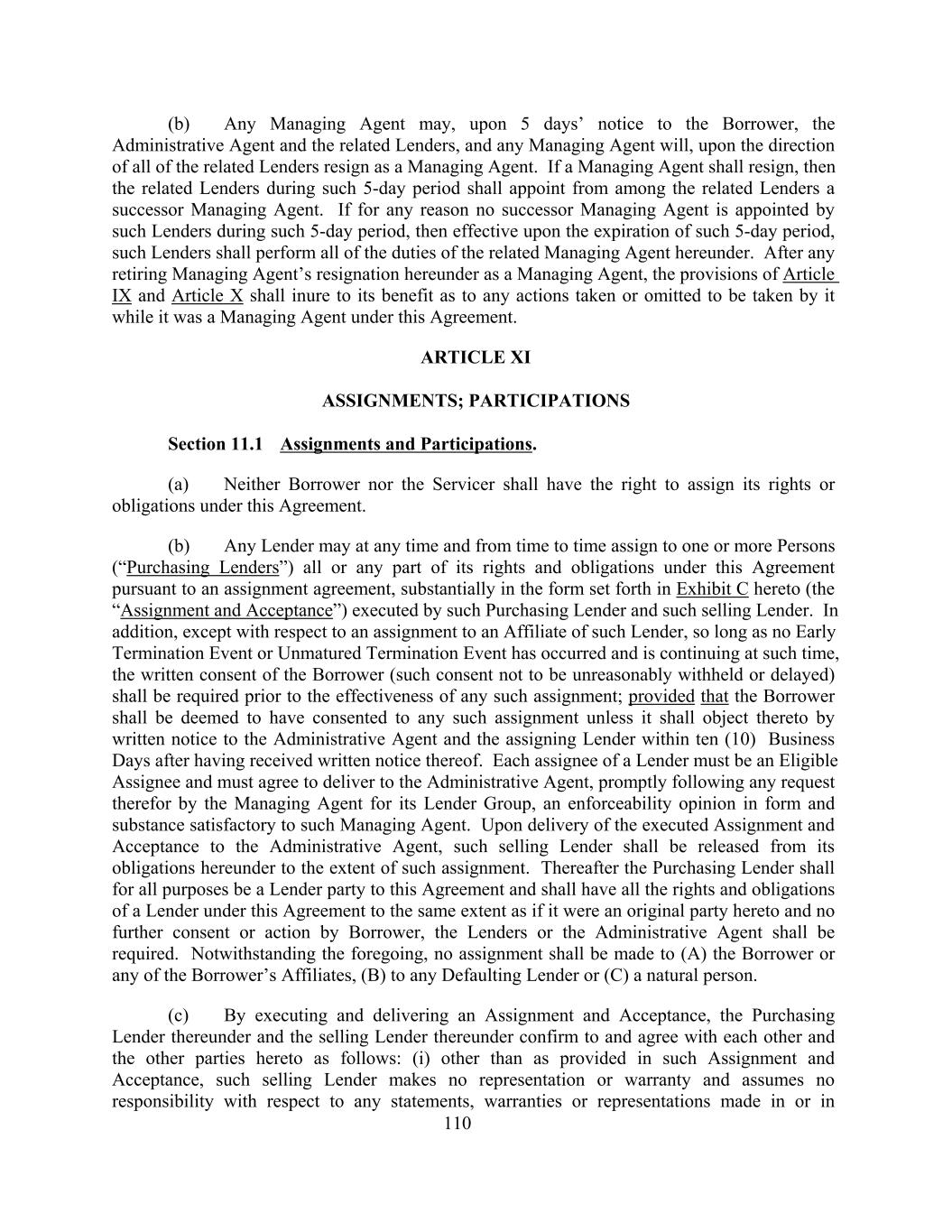 (b) Any Managing Agent may, upon 5 days’ notice to the Borrower, the Administrative Agent and the related Lenders, and any Managing Agent will, upon the direction of all of the related Lenders resign as a Managing Agent. If a Managing Agent shall resign, then the related Lenders during such 5-day period shall appoint from among the related Lenders a successor Managing Agent. If for any reason no successor Managing Agent is appointed by such Lenders during such 5-day period, then effective upon the expiration of such 5-day period, such Lenders shall perform all of the duties of the related Managing Agent hereunder. After any retiring Managing Agent’s resignation hereunder as a Managing Agent, the provisions of Article IX and Article X shall inure to its benefit as to any actions taken or omitted to be taken by it while it was a Managing Agent under this Agreement. ARTICLE XI ASSIGNMENTS; PARTICIPATIONS Section 11.1 Assignments and Participations. (a) Neither Borrower nor the Servicer shall have the right to assign its rights or obligations under this Agreement. (b) Any Lender may at any time and from time to time assign to one or more Persons (“Purchasing Lenders”) all or any part of its rights and obligations under this Agreement pursuant to an assignment agreement, substantially in the form set forth in Exhibit C hereto (the “Assignment and Acceptance”) executed by such Purchasing Lender and such selling Lender. In addition, except with respect to an assignment to an Affiliate of such Lender, so long as no Early Termination Event or Unmatured Termination Event has occurred and is continuing at such time, the written consent of the Borrower (such consent not to be unreasonably withheld or delayed) shall be required prior to the effectiveness of any such assignment; provided that the Borrower shall be deemed to have consented to any such assignment unless it shall object thereto by written notice to the Administrative Agent and the assigning Lender within ten (10) Business Days after having received written notice thereof. Each assignee of a Lender must be an Eligible Assignee and must agree to deliver to the Administrative Agent, promptly following any request therefor by the Managing Agent for its Lender Group, an enforceability opinion in form and substance satisfactory to such Managing Agent. Upon delivery of the executed Assignment and Acceptance to the Administrative Agent, such selling Lender shall be released from its obligations hereunder to the extent of such assignment. Thereafter the Purchasing Lender shall for all purposes be a Lender party to this Agreement and shall have all the rights and obligations of a Lender under this Agreement to the same extent as if it were an original party hereto and no further consent or action by Borrower, the Lenders or the Administrative Agent shall be required. Notwithstanding the foregoing, no assignment shall be made to (A) the Borrower or any of the Borrower’s Affiliates, (B) to any Defaulting Lender or (C) a natural person. (c) By executing and delivering an Assignment and Acceptance, the Purchasing Lender thereunder and the selling Lender thereunder confirm to and agree with each other and the other parties hereto as follows: (i) other than as provided in such Assignment and Acceptance, such selling Lender makes no representation or warranty and assumes no responsibility with respect to any statements, warranties or representations made in or in 110