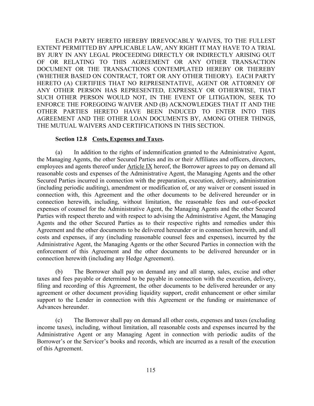 EACH PARTY HERETO HEREBY IRREVOCABLY WAIVES, TO THE FULLEST EXTENT PERMITTED BY APPLICABLE LAW, ANY RIGHT IT MAY HAVE TO A TRIAL BY JURY IN ANY LEGAL PROCEEDING DIRECTLY OR INDIRECTLY ARISING OUT OF OR RELATING TO THIS AGREEMENT OR ANY OTHER TRANSACTION DOCUMENT OR THE TRANSACTIONS CONTEMPLATED HEREBY OR THEREBY (WHETHER BASED ON CONTRACT, TORT OR ANY OTHER THEORY). EACH PARTY HERETO (A) CERTIFIES THAT NO REPRESENTATIVE, AGENT OR ATTORNEY OF ANY OTHER PERSON HAS REPRESENTED, EXPRESSLY OR OTHERWISE, THAT SUCH OTHER PERSON WOULD NOT, IN THE EVENT OF LITIGATION, SEEK TO ENFORCE THE FOREGOING WAIVER AND (B) ACKNOWLEDGES THAT IT AND THE OTHER PARTIES HERETO HAVE BEEN INDUCED TO ENTER INTO THIS AGREEMENT AND THE OTHER LOAN DOCUMENTS BY, AMONG OTHER THINGS, THE MUTUAL WAIVERS AND CERTIFICATIONS IN THIS SECTION. Section 12.8 Costs, Expenses and Taxes. (a) In addition to the rights of indemnification granted to the Administrative Agent, the Managing Agents, the other Secured Parties and its or their Affiliates and officers, directors, employees and agents thereof under Article IX hereof, the Borrower agrees to pay on demand all reasonable costs and expenses of the Administrative Agent, the Managing Agents and the other Secured Parties incurred in connection with the preparation, execution, delivery, administration (including periodic auditing), amendment or modification of, or any waiver or consent issued in connection with, this Agreement and the other documents to be delivered hereunder or in connection herewith, including, without limitation, the reasonable fees and out-of-pocket expenses of counsel for the Administrative Agent, the Managing Agents and the other Secured Parties with respect thereto and with respect to advising the Administrative Agent, the Managing Agents and the other Secured Parties as to their respective rights and remedies under this Agreement and the other documents to be delivered hereunder or in connection herewith, and all costs and expenses, if any (including reasonable counsel fees and expenses), incurred by the Administrative Agent, the Managing Agents or the other Secured Parties in connection with the enforcement of this Agreement and the other documents to be delivered hereunder or in connection herewith (including any Hedge Agreement). (b) The Borrower shall pay on demand any and all stamp, sales, excise and other taxes and fees payable or determined to be payable in connection with the execution, delivery, filing and recording of this Agreement, the other documents to be delivered hereunder or any agreement or other document providing liquidity support, credit enhancement or other similar support to the Lender in connection with this Agreement or the funding or maintenance of Advances hereunder. (c) The Borrower shall pay on demand all other costs, expenses and taxes (excluding income taxes), including, without limitation, all reasonable costs and expenses incurred by the Administrative Agent or any Managing Agent in connection with periodic audits of the Borrower’s or the Servicer’s books and records, which are incurred as a result of the execution of this Agreement. 115