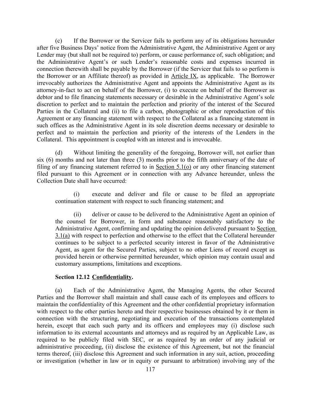 (c) If the Borrower or the Servicer fails to perform any of its obligations hereunder after five Business Days’ notice from the Administrative Agent, the Administrative Agent or any Lender may (but shall not be required to) perform, or cause performance of, such obligation; and the Administrative Agent’s or such Lender’s reasonable costs and expenses incurred in connection therewith shall be payable by the Borrower (if the Servicer that fails to so perform is the Borrower or an Affiliate thereof) as provided in Article IX, as applicable. The Borrower irrevocably authorizes the Administrative Agent and appoints the Administrative Agent as its attorney-in-fact to act on behalf of the Borrower, (i) to execute on behalf of the Borrower as debtor and to file financing statements necessary or desirable in the Administrative Agent’s sole discretion to perfect and to maintain the perfection and priority of the interest of the Secured Parties in the Collateral and (ii) to file a carbon, photographic or other reproduction of this Agreement or any financing statement with respect to the Collateral as a financing statement in such offices as the Administrative Agent in its sole discretion deems necessary or desirable to perfect and to maintain the perfection and priority of the interests of the Lenders in the Collateral. This appointment is coupled with an interest and is irrevocable. (d) Without limiting the generality of the foregoing, Borrower will, not earlier than six (6) months and not later than three (3) months prior to the fifth anniversary of the date of filing of any financing statement referred to in Section 5.1(o) or any other financing statement filed pursuant to this Agreement or in connection with any Advance hereunder, unless the Collection Date shall have occurred: (i) execute and deliver and file or cause to be filed an appropriate continuation statement with respect to such financing statement; and (ii) deliver or cause to be delivered to the Administrative Agent an opinion of the counsel for Borrower, in form and substance reasonably satisfactory to the Administrative Agent, confirming and updating the opinion delivered pursuant to Section 3.1(a) with respect to perfection and otherwise to the effect that the Collateral hereunder continues to be subject to a perfected security interest in favor of the Administrative Agent, as agent for the Secured Parties, subject to no other Liens of record except as provided herein or otherwise permitted hereunder, which opinion may contain usual and customary assumptions, limitations and exceptions. Section 12.12 Confidentiality. (a) Each of the Administrative Agent, the Managing Agents, the other Secured Parties and the Borrower shall maintain and shall cause each of its employees and officers to maintain the confidentiality of this Agreement and the other confidential proprietary information with respect to the other parties hereto and their respective businesses obtained by it or them in connection with the structuring, negotiating and execution of the transactions contemplated herein, except that each such party and its officers and employees may (i) disclose such information to its external accountants and attorneys and as required by an Applicable Law, as required to be publicly filed with SEC, or as required by an order of any judicial or administrative proceeding, (ii) disclose the existence of this Agreement, but not the financial terms thereof, (iii) disclose this Agreement and such information in any suit, action, proceeding or investigation (whether in law or in equity or pursuant to arbitration) involving any of the 117