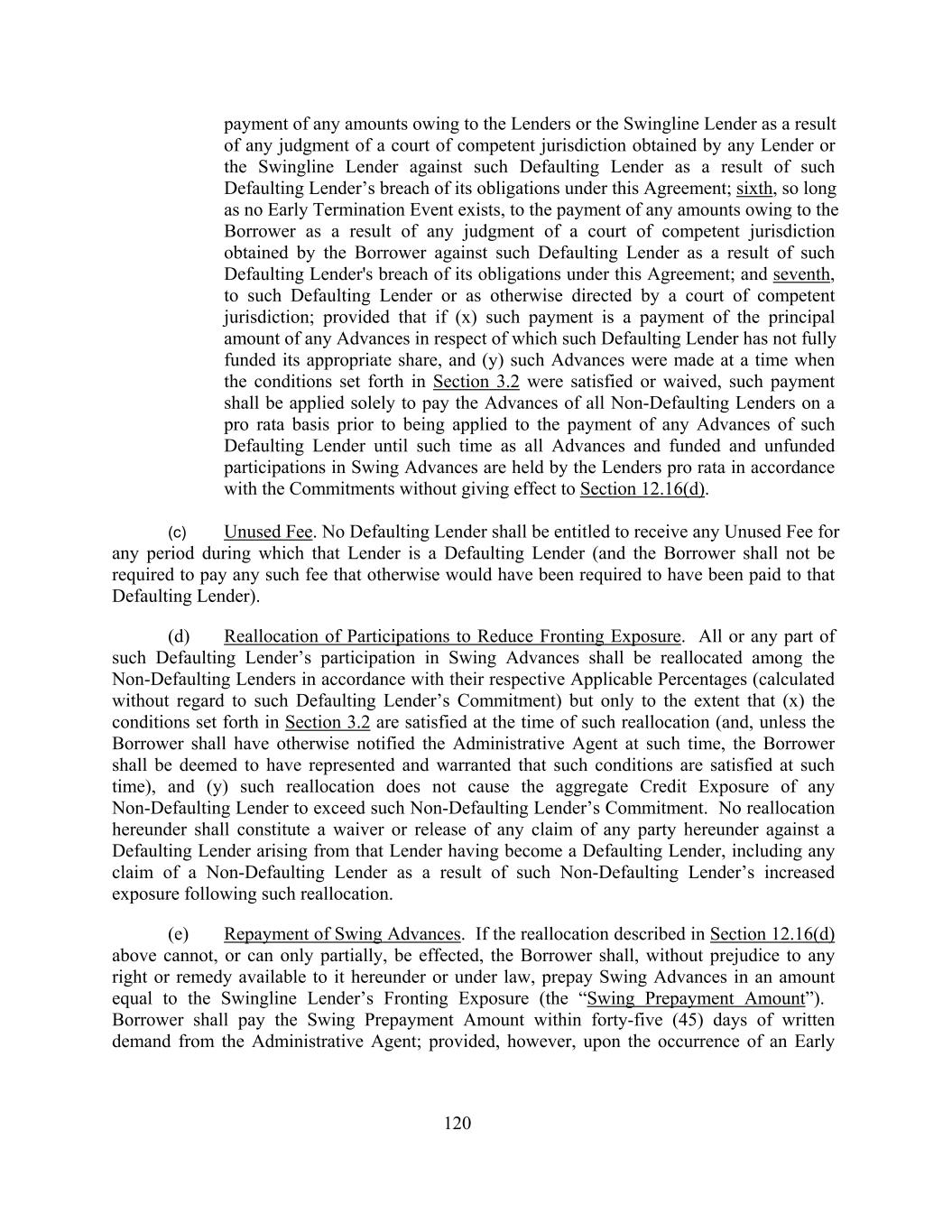 payment of any amounts owing to the Lenders or the Swingline Lender as a result of any judgment of a court of competent jurisdiction obtained by any Lender or the Swingline Lender against such Defaulting Lender as a result of such Defaulting Lender’s breach of its obligations under this Agreement; sixth, so long as no Early Termination Event exists, to the payment of any amounts owing to the Borrower as a result of any judgment of a court of competent jurisdiction obtained by the Borrower against such Defaulting Lender as a result of such Defaulting Lender's breach of its obligations under this Agreement; and seventh, to such Defaulting Lender or as otherwise directed by a court of competent jurisdiction; provided that if (x) such payment is a payment of the principal amount of any Advances in respect of which such Defaulting Lender has not fully funded its appropriate share, and (y) such Advances were made at a time when the conditions set forth in Section 3.2 were satisfied or waived, such payment shall be applied solely to pay the Advances of all Non-Defaulting Lenders on a pro rata basis prior to being applied to the payment of any Advances of such Defaulting Lender until such time as all Advances and funded and unfunded participations in Swing Advances are held by the Lenders pro rata in accordance with the Commitments without giving effect to Section 12.16(d). (c) Unused Fee. No Defaulting Lender shall be entitled to receive any Unused Fee for any period during which that Lender is a Defaulting Lender (and the Borrower shall not be required to pay any such fee that otherwise would have been required to have been paid to that Defaulting Lender). (d) Reallocation of Participations to Reduce Fronting Exposure. All or any part of such Defaulting Lender’s participation in Swing Advances shall be reallocated among the Non-Defaulting Lenders in accordance with their respective Applicable Percentages (calculated without regard to such Defaulting Lender’s Commitment) but only to the extent that (x) the conditions set forth in Section 3.2 are satisfied at the time of such reallocation (and, unless the Borrower shall have otherwise notified the Administrative Agent at such time, the Borrower shall be deemed to have represented and warranted that such conditions are satisfied at such time), and (y) such reallocation does not cause the aggregate Credit Exposure of any Non-Defaulting Lender to exceed such Non-Defaulting Lender’s Commitment. No reallocation hereunder shall constitute a waiver or release of any claim of any party hereunder against a Defaulting Lender arising from that Lender having become a Defaulting Lender, including any claim of a Non-Defaulting Lender as a result of such Non-Defaulting Lender’s increased exposure following such reallocation. (e) Repayment of Swing Advances. If the reallocation described in Section 12.16(d) above cannot, or can only partially, be effected, the Borrower shall, without prejudice to any right or remedy available to it hereunder or under law, prepay Swing Advances in an amount equal to the Swingline Lender’s Fronting Exposure (the “Swing Prepayment Amount”). Borrower shall pay the Swing Prepayment Amount within forty-five (45) days of written demand from the Administrative Agent; provided, however, upon the occurrence of an Early 120