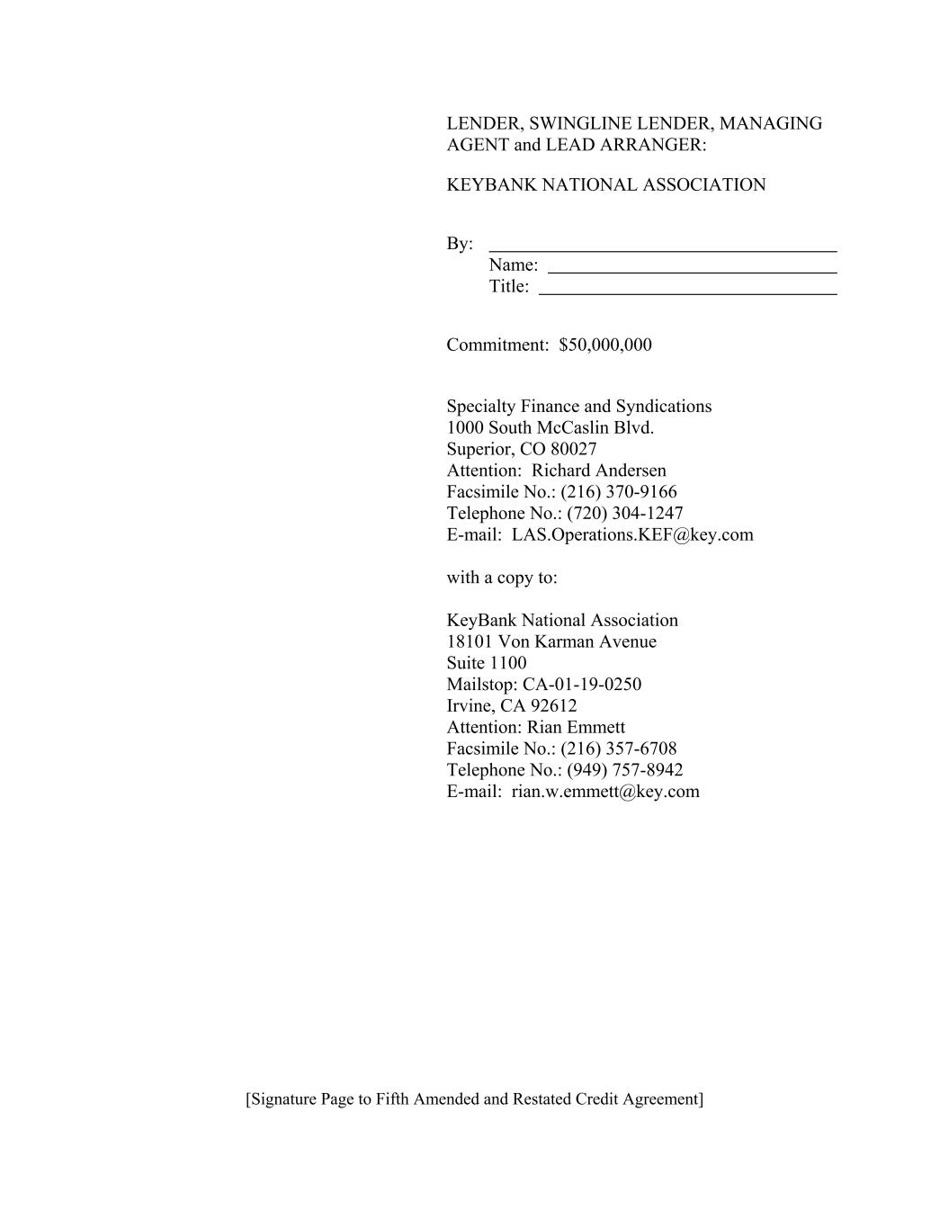 LENDER, SWINGLINE LENDER, MANAGING AGENT and LEAD ARRANGER: KEYBANK NATIONAL ASSOCIATION By: Name: Title: Commitment: $50,000,000 Specialty Finance and Syndications 1000 South McCaslin Blvd. Superior, CO 80027 Attention: Richard Andersen Facsimile No.: (216) 370-9166 Telephone No.: (720) 304-1247 E-mail: LAS.Operations.KEF@key.com with a copy to: KeyBank National Association 18101 Von Karman Avenue Suite 1100 Mailstop: CA-01-19-0250 Irvine, CA 92612 Attention: Rian Emmett Facsimile No.: (216) 357-6708 Telephone No.: (949) 757-8942 E-mail: rian.w.emmett@key.com [Signature Page to Fifth Amended and Restated Credit Agreement]