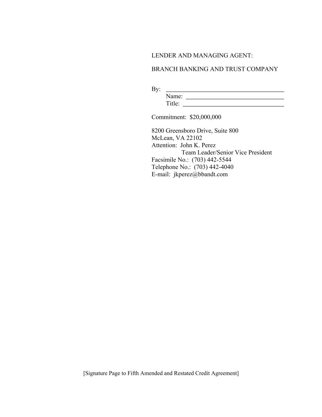 LENDER AND MANAGING AGENT: BRANCH BANKING AND TRUST COMPANY By: Name: Title: Commitment: $20,000,000 8200 Greensboro Drive, Suite 800 McLean, VA 22102 Attention: John K. Perez Team Leader/Senior Vice President Facsimile No.: (703) 442-5544 Telephone No.: (703) 442-4040 E-mail: jkperez@bbandt.com [Signature Page to Fifth Amended and Restated Credit Agreement]