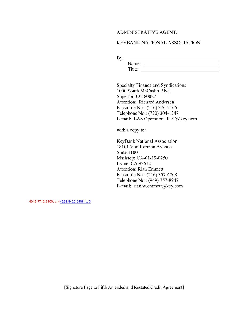 ADMINISTRATIVE AGENT: KEYBANK NATIONAL ASSOCIATION By: Name: Title: Specialty Finance and Syndications 1000 South McCaslin Blvd. Superior, CO 80027 Attention: Richard Andersen Facsimile No.: (216) 370-9166 Telephone No.: (720) 304-1247 E-mail: LAS.Operations.KEF@key.com with a copy to: KeyBank National Association 18101 Von Karman Avenue Suite 1100 Mailstop: CA-01-19-0250 Irvine, CA 92612 Attention: Rian Emmett Facsimile No.: (216) 357-6708 Telephone No.: (949) 757-8942 E-mail: rian.w.emmett@key.com 4915-7712-3100, v. 44928-8422-9506, v. 3 [Signature Page to Fifth Amended and Restated Credit Agreement]
