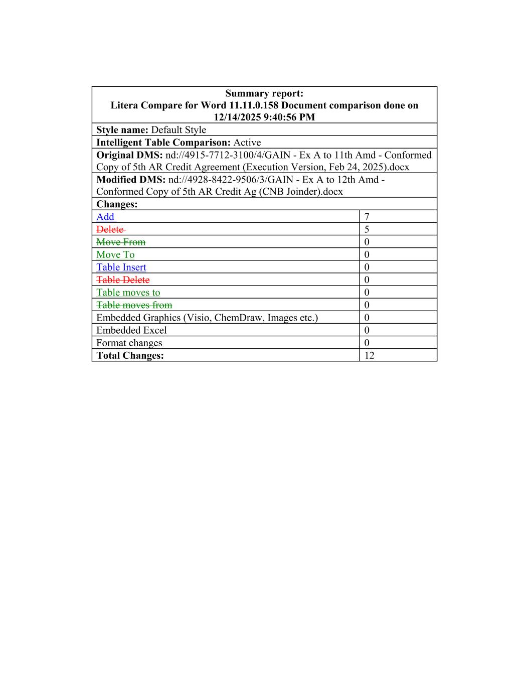 0 Table Insert Changes: 0 Table Delete 0 Add Intelligent Table Comparison: Active Table moves to 7 0 Summary report: Litera Compare for Word 11.11.0.158 Document comparison done on 12/14/2025 9:40:56 PM Table moves from 0 Delete Embedded Graphics (Visio, ChemDraw, Images etc.) 5 0 Original DMS: nd://4915-7712-3100/4/GAIN - Ex A to 11th Amd - Conformed Copy of 5th AR Credit Agreement (Execution Version, Feb 24, 2025).docx Embedded Excel 0 Move From Format changes 0 0 Total Changes: Modified DMS: nd://4928-8422-9506/3/GAIN - Ex A to 12th Amd - Conformed Copy of 5th AR Credit Ag (CNB Joinder).docx 12 Move To Style name: Default Style