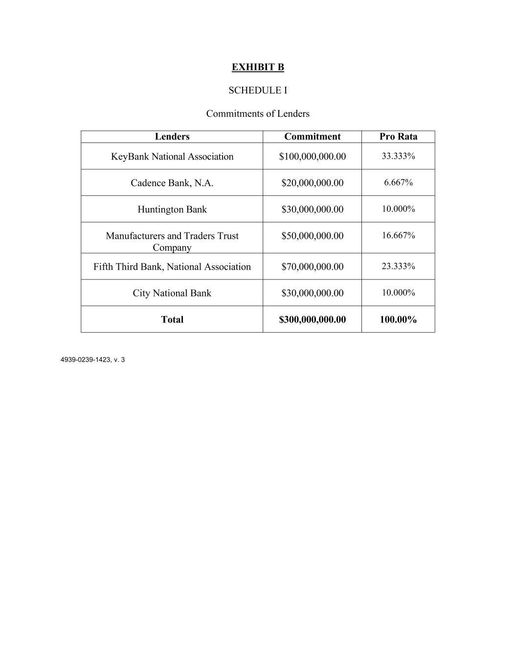 EXHIBIT B SCHEDULE I Commitments of Lenders Lenders Commitment Pro Rata KeyBank National Association $100,000,000.00 33.333% Cadence Bank, N.A. $20,000,000.00 6.667% Huntington Bank $30,000,000.00 10.000% Manufacturers and Traders Trust Company $50,000,000.00 16.667% Fifth Third Bank, National Association $70,000,000.00 23.333% City National Bank $30,000,000.00 10.000% Total $300,000,000.00 100.00% 4939-0239-1423, v. 3