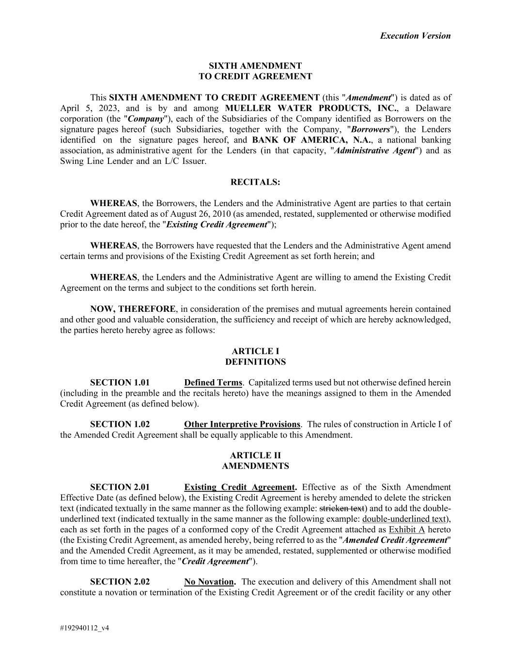 Execution Version #192940112_v4 SIXTH AMENDMENT TO CREDIT AGREEMENT This SIXTH AMENDMENT TO CREDIT AGREEMENT (this "Amendment") is dated as of April 5, 2023, and is by and among MUELLER WATER PRODUCTS, INC., a Delaware corporation (the "Company"), each of the Subsidiaries of the Company identified as Borrowers on the signature pages hereof (such Subsidiaries, together with the Company, "Borrowers"), the Lenders identified on the signature pages hereof, and BANK OF AMERICA, N.A., a national banking association, as administrative agent for the Lenders (in that capacity, "Administrative Agent") and as Swing Line Lender and an L/C Issuer. RECITALS: WHEREAS, the Borrowers, the Lenders and the Administrative Agent are parties to that certain Credit Agreement dated as of August 26, 2010 (as amended, restated, supplemented or otherwise modified prior to the date hereof, the "Existing Credit Agreement"); WHEREAS, the Borrowers have requested that the Lenders and the Administrative Agent amend certain terms and provisions of the Existing Credit Agreement as set forth herein; and WHEREAS, the Lenders and the Administrative Agent are willing to amend the Existing Credit Agreement on the terms and subject to the conditions set forth herein. NOW, THEREFORE, in consideration of the premises and mutual agreements herein contained and other good and valuable consideration, the sufficiency and receipt of which are hereby acknowledged, the parties hereto hereby agree as follows: ARTICLE I DEFINITIONS SECTION 1.01 Defined Terms. Capitalized terms used but not otherwise defined herein (including in the preamble and the recitals hereto) have the meanings assigned to them in the Amended Credit Agreement (as defined below). SECTION 1.02 Other Interpretive Provisions. The rules of construction in Article I of the Amended Credit Agreement shall be equally applicable to this Amendment. ARTICLE II AMENDMENTS SECTION 2.01 Existing Credit Agreement. Effective as of the Sixth Amendment Effective Date (as defined below), the Existing Credit Agreement is hereby amended to delete the stricken text (indicated textually in the same manner as the following example: stricken text) and to add the double- underlined text (indicated textually in the same manner as the following example: double-underlined text), each as set forth in the pages of a conformed copy of the Credit Agreement attached as Exhibit A hereto (the Existing Credit Agreement, as amended hereby, being referred to as the "Amended Credit Agreement" and the Amended Credit Agreement, as it may be amended, restated, supplemented or otherwise modified from time to time hereafter, the "Credit Agreement"). SECTION 2.02 No Novation. The execution and delivery of this Amendment shall not constitute a novation or termination of the Existing Credit Agreement or of the credit facility or any other
