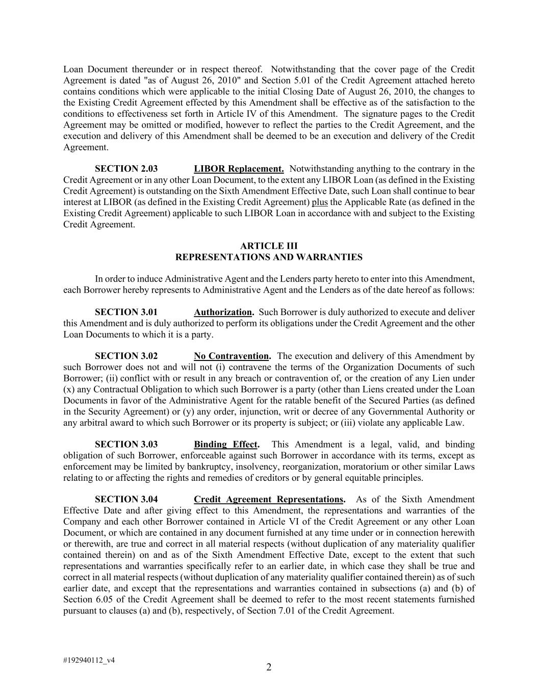 #192940112_v4 2 Loan Document thereunder or in respect thereof. Notwithstanding that the cover page of the Credit Agreement is dated "as of August 26, 2010" and Section 5.01 of the Credit Agreement attached hereto contains conditions which were applicable to the initial Closing Date of August 26, 2010, the changes to the Existing Credit Agreement effected by this Amendment shall be effective as of the satisfaction to the conditions to effectiveness set forth in Article IV of this Amendment. The signature pages to the Credit Agreement may be omitted or modified, however to reflect the parties to the Credit Agreement, and the execution and delivery of this Amendment shall be deemed to be an execution and delivery of the Credit Agreement. SECTION 2.03 LIBOR Replacement. Notwithstanding anything to the contrary in the Credit Agreement or in any other Loan Document, to the extent any LIBOR Loan (as defined in the Existing Credit Agreement) is outstanding on the Sixth Amendment Effective Date, such Loan shall continue to bear interest at LIBOR (as defined in the Existing Credit Agreement) plus the Applicable Rate (as defined in the Existing Credit Agreement) applicable to such LIBOR Loan in accordance with and subject to the Existing Credit Agreement. ARTICLE III REPRESENTATIONS AND WARRANTIES In order to induce Administrative Agent and the Lenders party hereto to enter into this Amendment, each Borrower hereby represents to Administrative Agent and the Lenders as of the date hereof as follows: SECTION 3.01 Authorization. Such Borrower is duly authorized to execute and deliver this Amendment and is duly authorized to perform its obligations under the Credit Agreement and the other Loan Documents to which it is a party. SECTION 3.02 No Contravention. The execution and delivery of this Amendment by such Borrower does not and will not (i) contravene the terms of the Organization Documents of such Borrower; (ii) conflict with or result in any breach or contravention of, or the creation of any Lien under (x) any Contractual Obligation to which such Borrower is a party (other than Liens created under the Loan Documents in favor of the Administrative Agent for the ratable benefit of the Secured Parties (as defined in the Security Agreement) or (y) any order, injunction, writ or decree of any Governmental Authority or any arbitral award to which such Borrower or its property is subject; or (iii) violate any applicable Law. SECTION 3.03 Binding Effect. This Amendment is a legal, valid, and binding obligation of such Borrower, enforceable against such Borrower in accordance with its terms, except as enforcement may be limited by bankruptcy, insolvency, reorganization, moratorium or other similar Laws relating to or affecting the rights and remedies of creditors or by general equitable principles. SECTION 3.04 Credit Agreement Representations. As of the Sixth Amendment Effective Date and after giving effect to this Amendment, the representations and warranties of the Company and each other Borrower contained in Article VI of the Credit Agreement or any other Loan Document, or which are contained in any document furnished at any time under or in connection herewith or therewith, are true and correct in all material respects (without duplication of any materiality qualifier contained therein) on and as of the Sixth Amendment Effective Date, except to the extent that such representations and warranties specifically refer to an earlier date, in which case they shall be true and correct in all material respects (without duplication of any materiality qualifier contained therein) as of such earlier date, and except that the representations and warranties contained in subsections (a) and (b) of Section 6.05 of the Credit Agreement shall be deemed to refer to the most recent statements furnished pursuant to clauses (a) and (b), respectively, of Section 7.01 of the Credit Agreement.