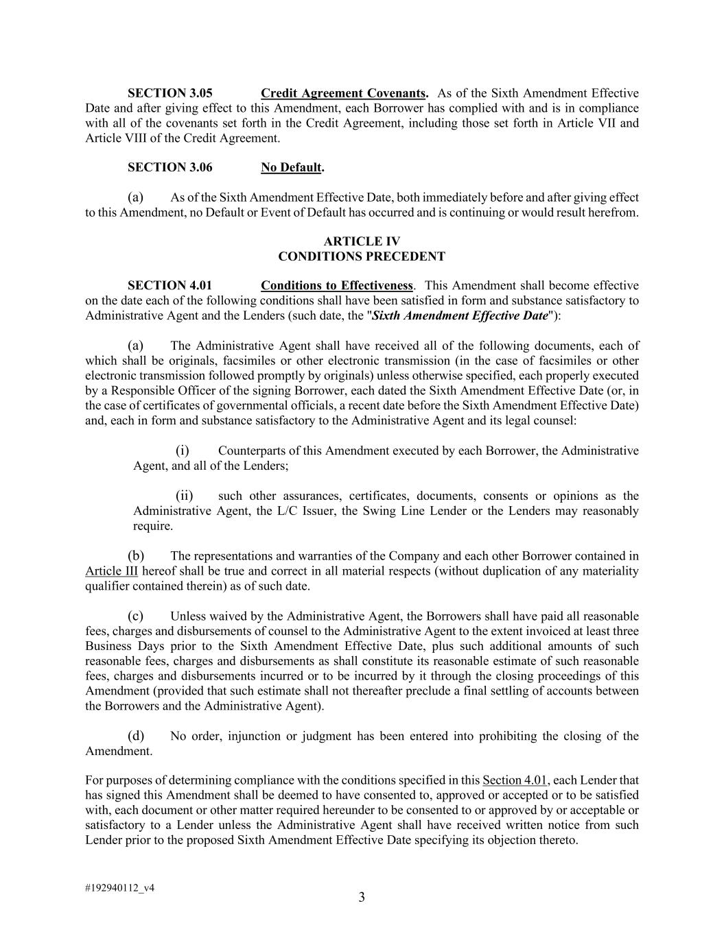 #192940112_v4 3 SECTION 3.05 Credit Agreement Covenants. As of the Sixth Amendment Effective Date and after giving effect to this Amendment, each Borrower has complied with and is in compliance with all of the covenants set forth in the Credit Agreement, including those set forth in Article VII and Article VIII of the Credit Agreement. SECTION 3.06 No Default. (a) As of the Sixth Amendment Effective Date, both immediately before and after giving effect to this Amendment, no Default or Event of Default has occurred and is continuing or would result herefrom. ARTICLE IV CONDITIONS PRECEDENT SECTION 4.01 Conditions to Effectiveness. This Amendment shall become effective on the date each of the following conditions shall have been satisfied in form and substance satisfactory to Administrative Agent and the Lenders (such date, the "Sixth Amendment Effective Date"): (a) The Administrative Agent shall have received all of the following documents, each of which shall be originals, facsimiles or other electronic transmission (in the case of facsimiles or other electronic transmission followed promptly by originals) unless otherwise specified, each properly executed by a Responsible Officer of the signing Borrower, each dated the Sixth Amendment Effective Date (or, in the case of certificates of governmental officials, a recent date before the Sixth Amendment Effective Date) and, each in form and substance satisfactory to the Administrative Agent and its legal counsel: (i) Counterparts of this Amendment executed by each Borrower, the Administrative Agent, and all of the Lenders; (ii) such other assurances, certificates, documents, consents or opinions as the Administrative Agent, the L/C Issuer, the Swing Line Lender or the Lenders may reasonably require. (b) The representations and warranties of the Company and each other Borrower contained in Article III hereof shall be true and correct in all material respects (without duplication of any materiality qualifier contained therein) as of such date. (c) Unless waived by the Administrative Agent, the Borrowers shall have paid all reasonable fees, charges and disbursements of counsel to the Administrative Agent to the extent invoiced at least three Business Days prior to the Sixth Amendment Effective Date, plus such additional amounts of such reasonable fees, charges and disbursements as shall constitute its reasonable estimate of such reasonable fees, charges and disbursements incurred or to be incurred by it through the closing proceedings of this Amendment (provided that such estimate shall not thereafter preclude a final settling of accounts between the Borrowers and the Administrative Agent). (d) No order, injunction or judgment has been entered into prohibiting the closing of the Amendment. For purposes of determining compliance with the conditions specified in this Section 4.01, each Lender that has signed this Amendment shall be deemed to have consented to, approved or accepted or to be satisfied with, each document or other matter required hereunder to be consented to or approved by or acceptable or satisfactory to a Lender unless the Administrative Agent shall have received written notice from such Lender prior to the proposed Sixth Amendment Effective Date specifying its objection thereto.