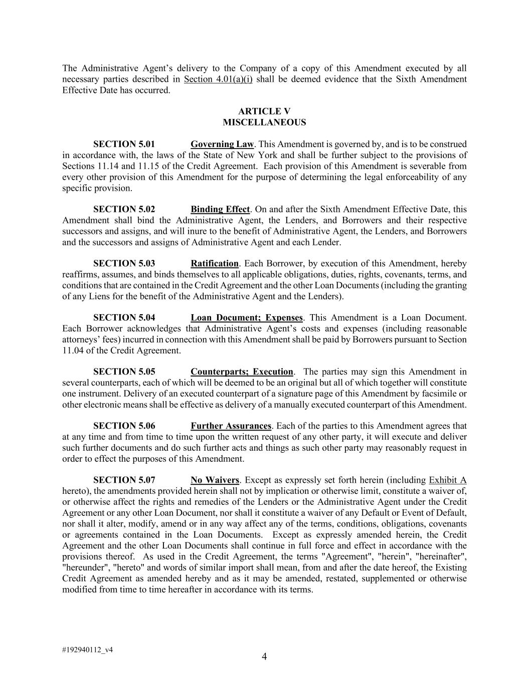 #192940112_v4 4 The Administrative Agent’s delivery to the Company of a copy of this Amendment executed by all necessary parties described in Section 4.01(a)(i) shall be deemed evidence that the Sixth Amendment Effective Date has occurred. ARTICLE V MISCELLANEOUS SECTION 5.01 Governing Law. This Amendment is governed by, and is to be construed in accordance with, the laws of the State of New York and shall be further subject to the provisions of Sections 11.14 and 11.15 of the Credit Agreement. Each provision of this Amendment is severable from every other provision of this Amendment for the purpose of determining the legal enforceability of any specific provision. SECTION 5.02 Binding Effect. On and after the Sixth Amendment Effective Date, this Amendment shall bind the Administrative Agent, the Lenders, and Borrowers and their respective successors and assigns, and will inure to the benefit of Administrative Agent, the Lenders, and Borrowers and the successors and assigns of Administrative Agent and each Lender. SECTION 5.03 Ratification. Each Borrower, by execution of this Amendment, hereby reaffirms, assumes, and binds themselves to all applicable obligations, duties, rights, covenants, terms, and conditions that are contained in the Credit Agreement and the other Loan Documents (including the granting of any Liens for the benefit of the Administrative Agent and the Lenders). SECTION 5.04 Loan Document; Expenses. This Amendment is a Loan Document. Each Borrower acknowledges that Administrative Agent’s costs and expenses (including reasonable attorneys’ fees) incurred in connection with this Amendment shall be paid by Borrowers pursuant to Section 11.04 of the Credit Agreement. SECTION 5.05 Counterparts; Execution. The parties may sign this Amendment in several counterparts, each of which will be deemed to be an original but all of which together will constitute one instrument. Delivery of an executed counterpart of a signature page of this Amendment by facsimile or other electronic means shall be effective as delivery of a manually executed counterpart of this Amendment. SECTION 5.06 Further Assurances. Each of the parties to this Amendment agrees that at any time and from time to time upon the written request of any other party, it will execute and deliver such further documents and do such further acts and things as such other party may reasonably request in order to effect the purposes of this Amendment. SECTION 5.07 No Waivers. Except as expressly set forth herein (including Exhibit A hereto), the amendments provided herein shall not by implication or otherwise limit, constitute a waiver of, or otherwise affect the rights and remedies of the Lenders or the Administrative Agent under the Credit Agreement or any other Loan Document, nor shall it constitute a waiver of any Default or Event of Default, nor shall it alter, modify, amend or in any way affect any of the terms, conditions, obligations, covenants or agreements contained in the Loan Documents. Except as expressly amended herein, the Credit Agreement and the other Loan Documents shall continue in full force and effect in accordance with the provisions thereof. As used in the Credit Agreement, the terms "Agreement", "herein", "hereinafter", "hereunder", "hereto" and words of similar import shall mean, from and after the date hereof, the Existing Credit Agreement as amended hereby and as it may be amended, restated, supplemented or otherwise modified from time to time hereafter in accordance with its terms.