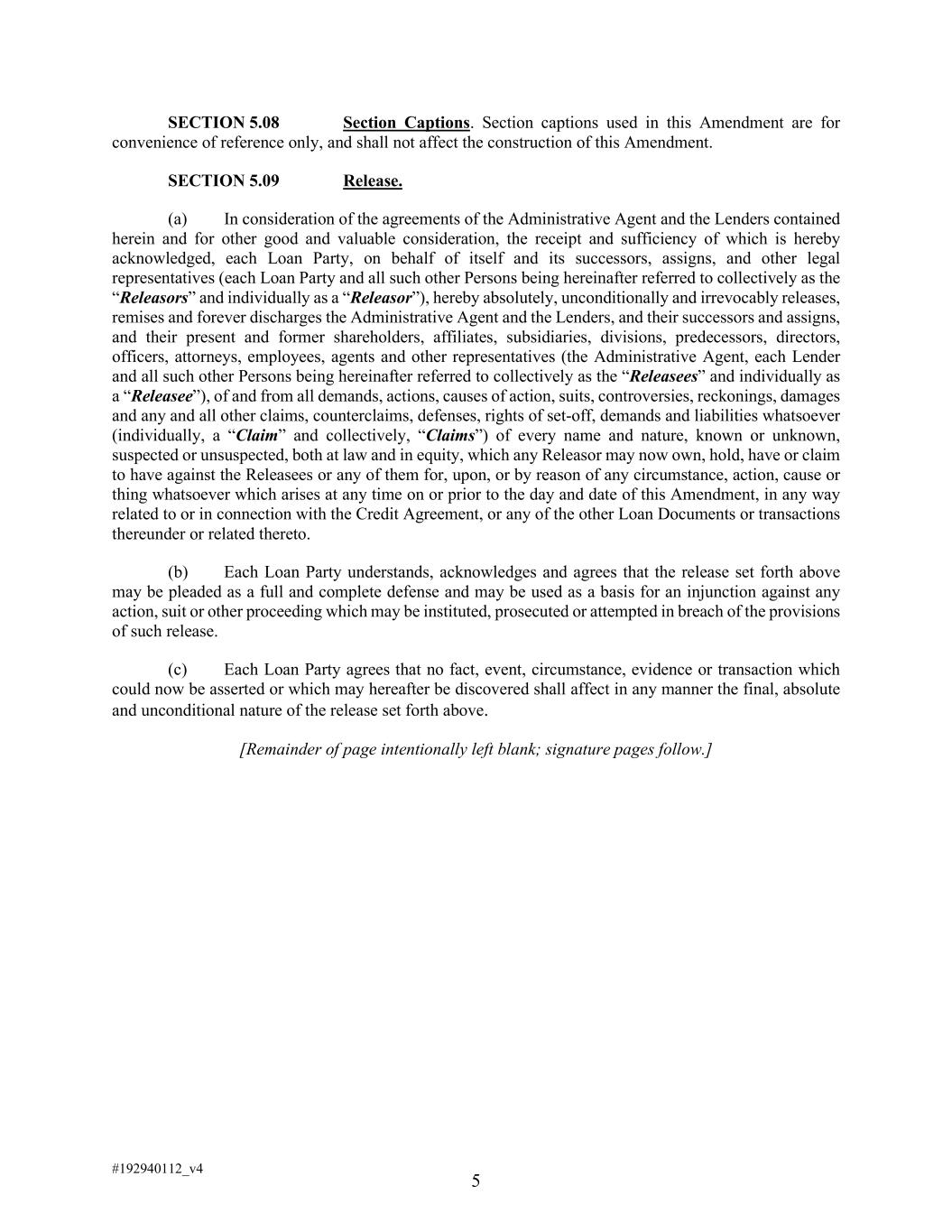 #192940112_v4 5 SECTION 5.08 Section Captions. Section captions used in this Amendment are for convenience of reference only, and shall not affect the construction of this Amendment. SECTION 5.09 Release. (a) In consideration of the agreements of the Administrative Agent and the Lenders contained herein and for other good and valuable consideration, the receipt and sufficiency of which is hereby acknowledged, each Loan Party, on behalf of itself and its successors, assigns, and other legal representatives (each Loan Party and all such other Persons being hereinafter referred to collectively as the “Releasors” and individually as a “Releasor”), hereby absolutely, unconditionally and irrevocably releases, remises and forever discharges the Administrative Agent and the Lenders, and their successors and assigns, and their present and former shareholders, affiliates, subsidiaries, divisions, predecessors, directors, officers, attorneys, employees, agents and other representatives (the Administrative Agent, each Lender and all such other Persons being hereinafter referred to collectively as the “Releasees” and individually as a “Releasee”), of and from all demands, actions, causes of action, suits, controversies, reckonings, damages and any and all other claims, counterclaims, defenses, rights of set-off, demands and liabilities whatsoever (individually, a “Claim” and collectively, “Claims”) of every name and nature, known or unknown, suspected or unsuspected, both at law and in equity, which any Releasor may now own, hold, have or claim to have against the Releasees or any of them for, upon, or by reason of any circumstance, action, cause or thing whatsoever which arises at any time on or prior to the day and date of this Amendment, in any way related to or in connection with the Credit Agreement, or any of the other Loan Documents or transactions thereunder or related thereto. (b) Each Loan Party understands, acknowledges and agrees that the release set forth above may be pleaded as a full and complete defense and may be used as a basis for an injunction against any action, suit or other proceeding which may be instituted, prosecuted or attempted in breach of the provisions of such release. (c) Each Loan Party agrees that no fact, event, circumstance, evidence or transaction which could now be asserted or which may hereafter be discovered shall affect in any manner the final, absolute and unconditional nature of the release set forth above. [Remainder of page intentionally left blank; signature pages follow.]