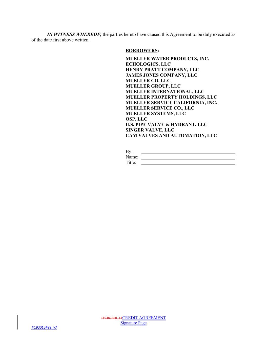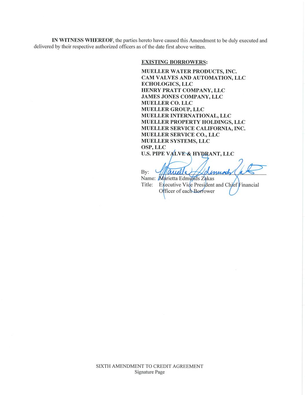 IN WITNESS WHEREOF, the parties hereto have caused this Agreement to be duly executed as of the date first above written. BORROWERS: MUELLER WATER PRODUCTS, INC. ECHOLOGICS, LLC HENRY PRATT COMPANY, LLC JAMES JONES COMPANY, LLC MUELLER CO. LLC MUELLER GROUP, LLC MUELLER INTERNATIONAL, LLC MUELLER PROPERTY HOLDINGS, LLC MUELLER SERVICE CALIFORNIA, INC. MUELLER SERVICE CO., LLC MUELLER SYSTEMS, LLC OSP, LLC U.S. PIPE VALVE & HYDRANT, LLC SINGER VALVE, LLC CAM VALVES AND AUTOMATION, LLC By: Name: Title: 119482860_14CREDIT AGREEMENT Signature Page #193013499_v7