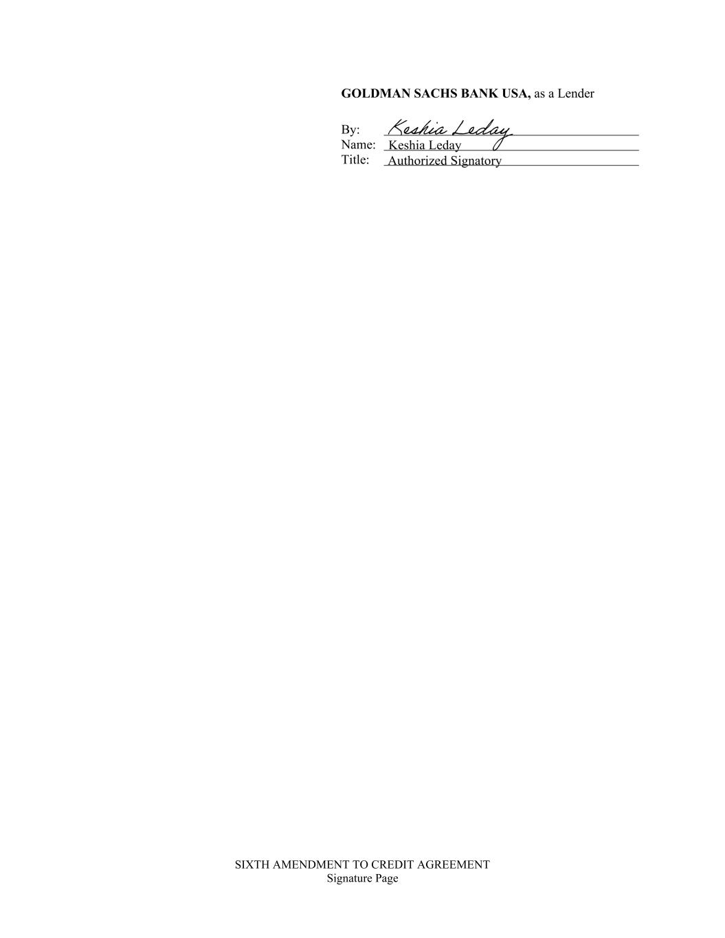 SIXTH AMENDMENT TO CREDIT AGREEMENT Signature Page GOLDMAN SACHS BANK USA, as a Lender By: Name: Title: Keshia Leday Authorized Signatory