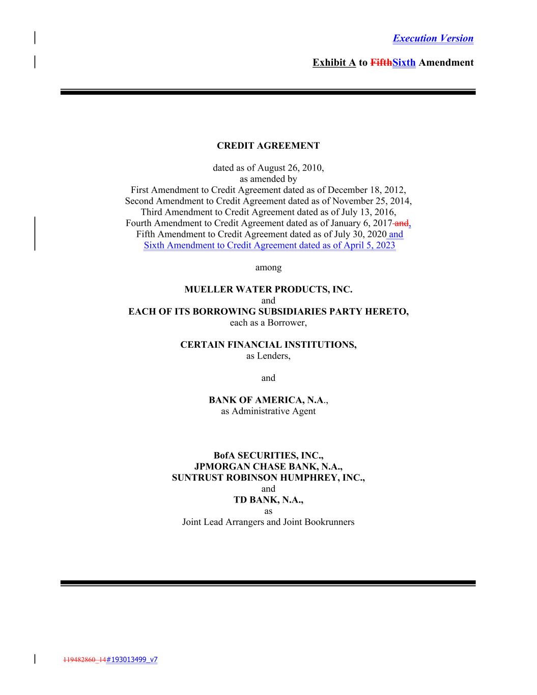 Execution Version Exhibit A to FifthSixth Amendment CREDIT AGREEMENT dated as of August 26, 2010, as amended by First Amendment to Credit Agreement dated as of December 18, 2012, Second Amendment to Credit Agreement dated as of November 25, 2014, Third Amendment to Credit Agreement dated as of July 13, 2016, Fourth Amendment to Credit Agreement dated as of January 6, 2017 and, Fifth Amendment to Credit Agreement dated as of July 30, 2020 and Sixth Amendment to Credit Agreement dated as of April 5, 2023 among MUELLER WATER PRODUCTS, INC. and EACH OF ITS BORROWING SUBSIDIARIES PARTY HERETO, each as a Borrower, CERTAIN FINANCIAL INSTITUTIONS, as Lenders, and BANK OF AMERICA, N.A., as Administrative Agent BofA SECURITIES, INC., JPMORGAN CHASE BANK, N.A., SUNTRUST ROBINSON HUMPHREY, INC., and TD BANK, N.A., as Joint Lead Arrangers and Joint Bookrunners 119482860_14#193013499_v7