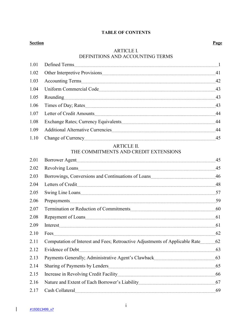 TABLE OF CONTENTS Section Page ARTICLE I. DEFINITIONS AND ACCOUNTING TERMS 1.01 Defined Terms 1 1.02 Other Interpretive Provisions 41 1.03 Accounting Terms 42 1.04 Uniform Commercial Code 43 1.05 Rounding 43 1.06 Times of Day; Rates 43 1.07 Letter of Credit Amounts 44 1.08 Exchange Rates; Currency Equivalents 44 1.09 Additional Alternative Currencies 44 1.10 Change of Currency 45 ARTICLE II. THE COMMITMENTS AND CREDIT EXTENSIONS 2.01 Borrower Agent 45 2.02 Revolving Loans 45 2.03 Borrowings, Conversions and Continuations of Loans 46 2.04 Letters of Credit 48 2.05 Swing Line Loans 57 2.06 Prepayments 59 2.07 Termination or Reduction of Commitments 60 2.08 Repayment of Loans 61 2.09 Interest 61 2.10 Fees 62 2.11 Computation of Interest and Fees; Retroactive Adjustments of Applicable Rate 62 2.12 Evidence of Debt 63 2.13 Payments Generally; Administrative Agent’s Clawback 63 2.14 Sharing of Payments by Lenders 65 2.15 Increase in Revolving Credit Facility 66 2.16 Nature and Extent of Each Borrower’s Liability 67 2.17 Cash Collateral 69 i #193013499_v7