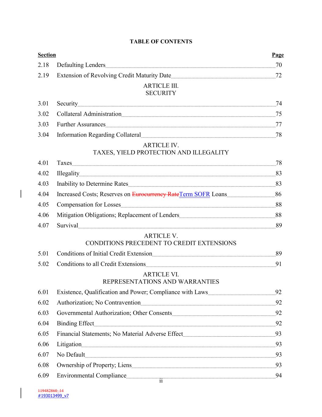 TABLE OF CONTENTS Section Page 2.18 Defaulting Lenders 70 2.19 Extension of Revolving Credit Maturity Date 72 ARTICLE III. SECURITY 3.01 Security 74 3.02 Collateral Administration 75 3.03 Further Assurances 77 3.04 Information Regarding Collateral 78 ARTICLE IV. TAXES, YIELD PROTECTION AND ILLEGALITY 4.01 Taxes 78 4.02 Illegality 83 4.03 Inability to Determine Rates 83 4.04 Increased Costs; Reserves on Eurocurrency RateTerm SOFR Loans 86 4.05 Compensation for Losses 88 4.06 Mitigation Obligations; Replacement of Lenders 88 4.07 Survival 89 ARTICLE V. CONDITIONS PRECEDENT TO CREDIT EXTENSIONS 5.01 Conditions of Initial Credit Extension 89 5.02 Conditions to all Credit Extensions 91 ARTICLE VI. REPRESENTATIONS AND WARRANTIES 6.01 Existence, Qualification and Power; Compliance with Laws 92 6.02 Authorization; No Contravention 92 6.03 Governmental Authorization; Other Consents 92 6.04 Binding Effect 92 6.05 Financial Statements; No Material Adverse Effect 93 6.06 Litigation 93 6.07 No Default 93 6.08 Ownership of Property; Liens 93 6.09 Environmental Compliance 94 ii 119482860_14 #193013499_v7