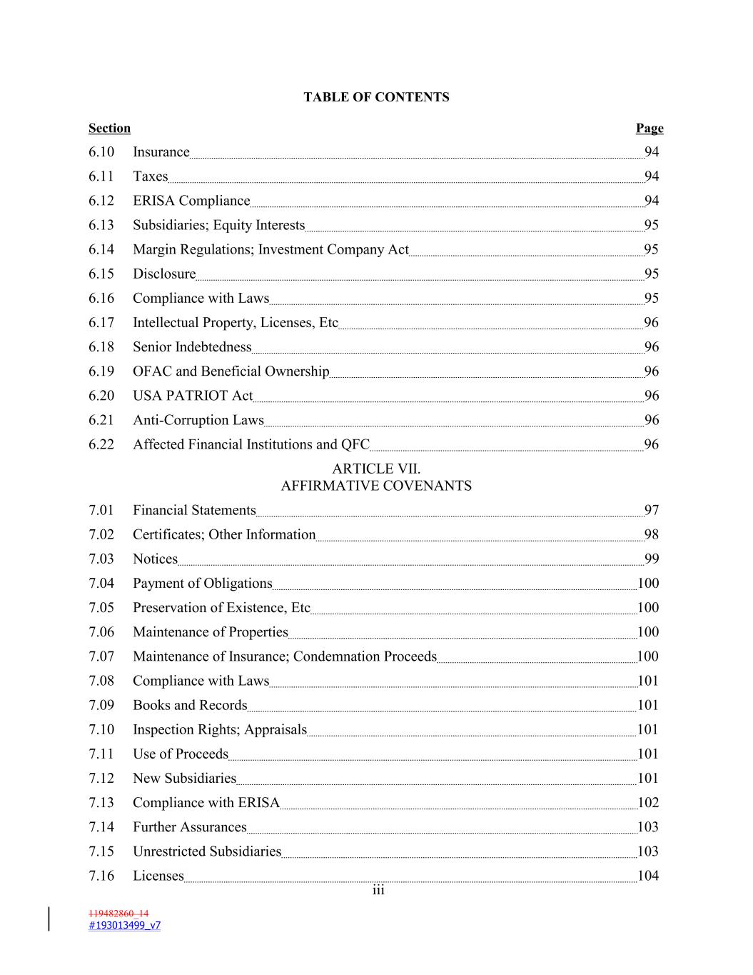 TABLE OF CONTENTS Section Page 6.10 Insurance 94 6.11 Taxes 94 6.12 ERISA Compliance 94 6.13 Subsidiaries; Equity Interests 95 6.14 Margin Regulations; Investment Company Act 95 6.15 Disclosure 95 6.16 Compliance with Laws 95 6.17 Intellectual Property, Licenses, Etc 96 6.18 Senior Indebtedness 96 6.19 OFAC and Beneficial Ownership 96 6.20 USA PATRIOT Act 96 6.21 Anti-Corruption Laws 96 6.22 Affected Financial Institutions and QFC 96 ARTICLE VII. AFFIRMATIVE COVENANTS 7.01 Financial Statements 97 7.02 Certificates; Other Information 98 7.03 Notices 99 7.04 Payment of Obligations 100 7.05 Preservation of Existence, Etc 100 7.06 Maintenance of Properties 100 7.07 Maintenance of Insurance; Condemnation Proceeds 100 7.08 Compliance with Laws 101 7.09 Books and Records 101 7.10 Inspection Rights; Appraisals 101 7.11 Use of Proceeds 101 7.12 New Subsidiaries 101 7.13 Compliance with ERISA 102 7.14 Further Assurances 103 7.15 Unrestricted Subsidiaries 103 7.16 Licenses 104 iii 119482860_14 #193013499_v7