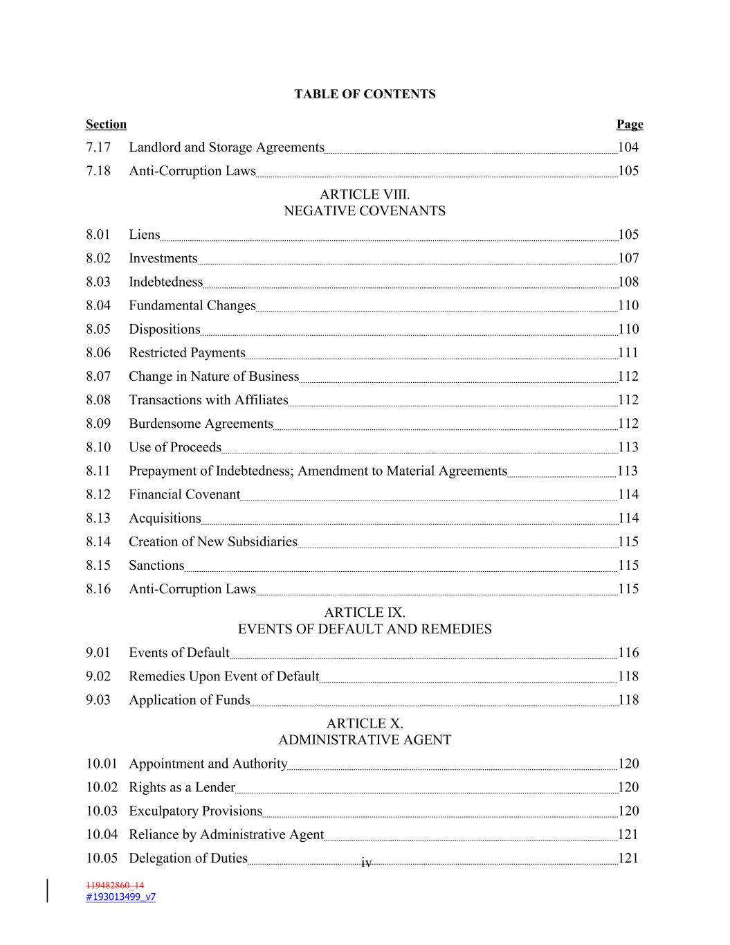 TABLE OF CONTENTS Section Page 7.17 Landlord and Storage Agreements 104 7.18 Anti-Corruption Laws 105 ARTICLE VIII. NEGATIVE COVENANTS 8.01 Liens 105 8.02 Investments 107 8.03 Indebtedness 108 8.04 Fundamental Changes 110 8.05 Dispositions 110 8.06 Restricted Payments 111 8.07 Change in Nature of Business 112 8.08 Transactions with Affiliates 112 8.09 Burdensome Agreements 112 8.10 Use of Proceeds 113 8.11 Prepayment of Indebtedness; Amendment to Material Agreements 113 8.12 Financial Covenant 114 8.13 Acquisitions 114 8.14 Creation of New Subsidiaries 115 8.15 Sanctions 115 8.16 Anti-Corruption Laws 115 ARTICLE IX. EVENTS OF DEFAULT AND REMEDIES 9.01 Events of Default 116 9.02 Remedies Upon Event of Default 118 9.03 Application of Funds 118 ARTICLE X. ADMINISTRATIVE AGENT 10.01 Appointment and Authority 120 10.02 Rights as a Lender 120 10.03 Exculpatory Provisions 120 10.04 Reliance by Administrative Agent 121 10.05 Delegation of Duties 121iv 119482860_14 #193013499_v7