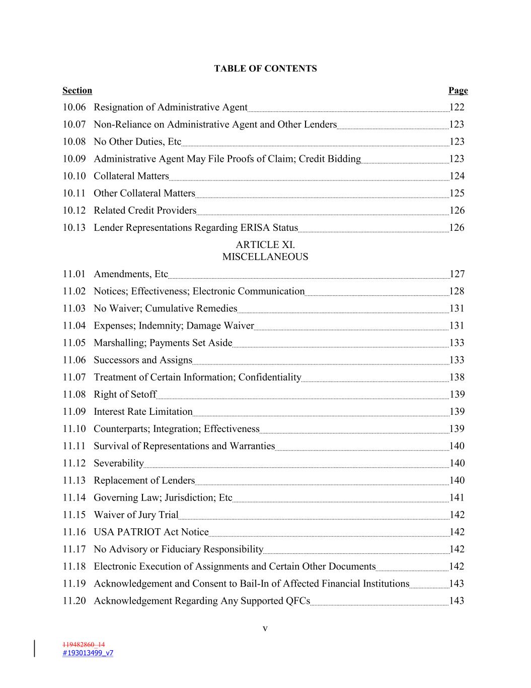 TABLE OF CONTENTS Section Page 10.06 Resignation of Administrative Agent 122 10.07 Non-Reliance on Administrative Agent and Other Lenders 123 10.08 No Other Duties, Etc 123 10.09 Administrative Agent May File Proofs of Claim; Credit Bidding 123 10.10 Collateral Matters 124 10.11 Other Collateral Matters 125 10.12 Related Credit Providers 126 10.13 Lender Representations Regarding ERISA Status 126 ARTICLE XI. MISCELLANEOUS 11.01 Amendments, Etc 127 11.02 Notices; Effectiveness; Electronic Communication 128 11.03 No Waiver; Cumulative Remedies 131 11.04 Expenses; Indemnity; Damage Waiver 131 11.05 Marshalling; Payments Set Aside 133 11.06 Successors and Assigns 133 11.07 Treatment of Certain Information; Confidentiality 138 11.08 Right of Setoff 139 11.09 Interest Rate Limitation 139 11.10 Counterparts; Integration; Effectiveness 139 11.11 Survival of Representations and Warranties 140 11.12 Severability 140 11.13 Replacement of Lenders 140 11.14 Governing Law; Jurisdiction; Etc 141 11.15 Waiver of Jury Trial 142 11.16 USA PATRIOT Act Notice 142 11.17 No Advisory or Fiduciary Responsibility 142 11.18 Electronic Execution of Assignments and Certain Other Documents 142 11.19 Acknowledgement and Consent to Bail-In of Affected Financial Institutions 143 11.20 Acknowledgement Regarding Any Supported QFCs 143 v 119482860_14 #193013499_v7