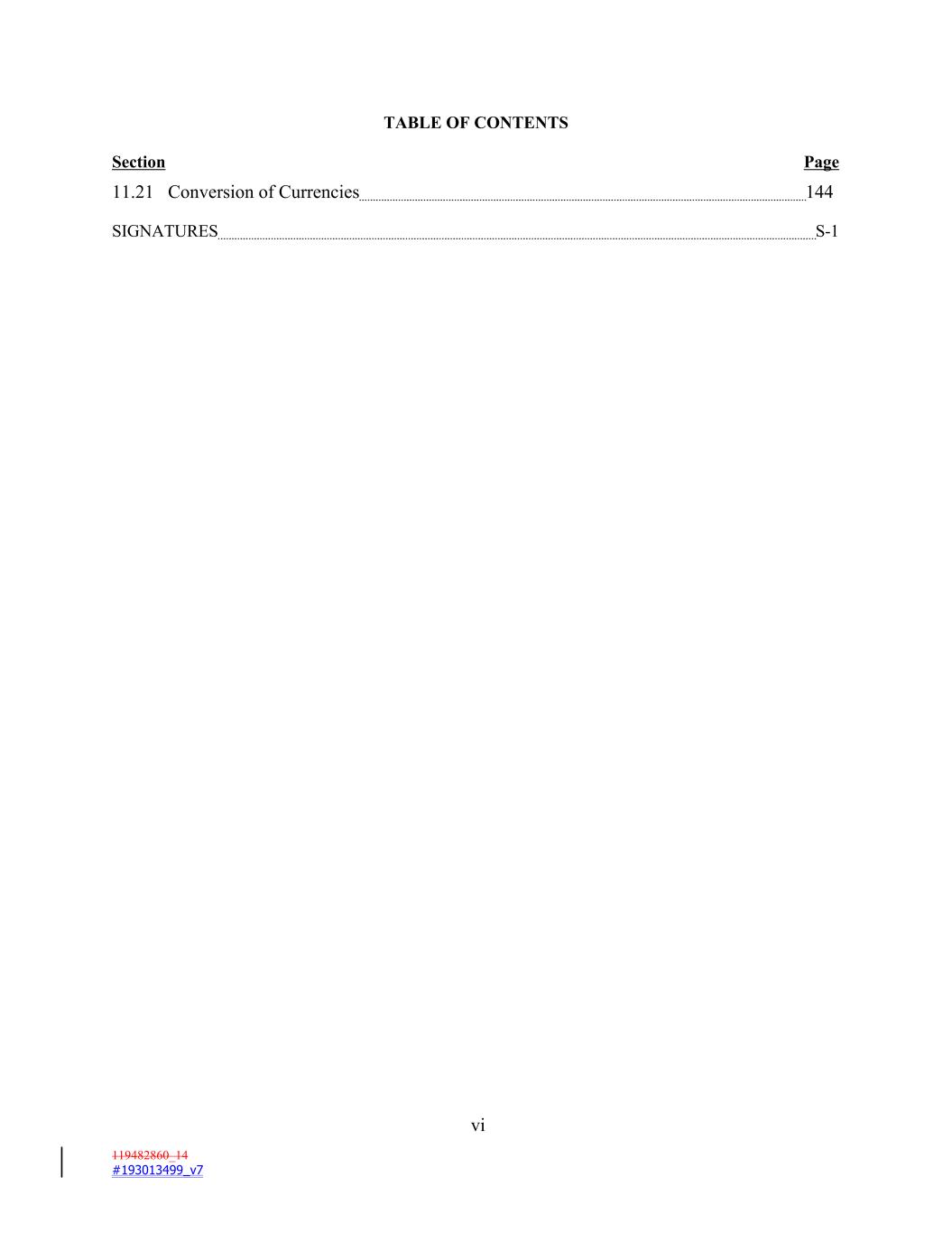 TABLE OF CONTENTS Section Page 11.21 Conversion of Currencies 144 SIGNATURES S-1 vi 119482860_14 #193013499_v7