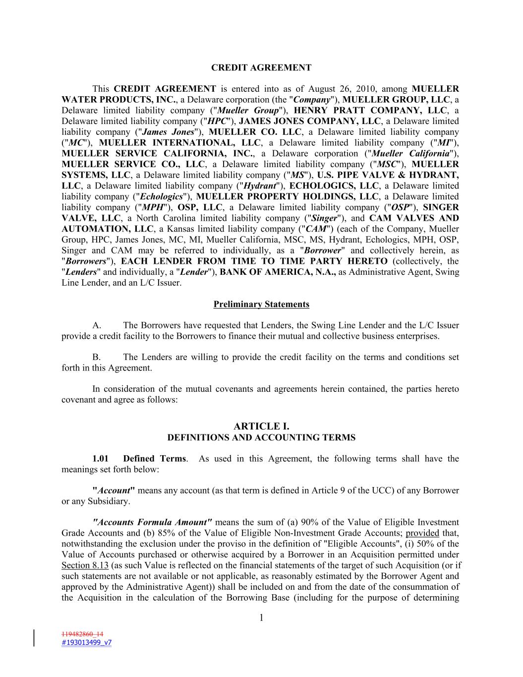 CREDIT AGREEMENT This CREDIT AGREEMENT is entered into as of August 26, 2010, among MUELLER WATER PRODUCTS, INC., a Delaware corporation (the "Company"), MUELLER GROUP, LLC, a Delaware limited liability company ("Mueller Group"), HENRY PRATT COMPANY, LLC, a Delaware limited liability company ("HPC"), JAMES JONES COMPANY, LLC, a Delaware limited liability company ("James Jones"), MUELLER CO. LLC, a Delaware limited liability company ("MC"), MUELLER INTERNATIONAL, LLC, a Delaware limited liability company ("MI"), MUELLER SERVICE CALIFORNIA, INC., a Delaware corporation ("Mueller California"), MUELLER SERVICE CO., LLC, a Delaware limited liability company ("MSC"), MUELLER SYSTEMS, LLC, a Delaware limited liability company ("MS"), U.S. PIPE VALVE & HYDRANT, LLC, a Delaware limited liability company ("Hydrant"), ECHOLOGICS, LLC, a Delaware limited liability company ("Echologics"), MUELLER PROPERTY HOLDINGS, LLC, a Delaware limited liability company ("MPH"), OSP, LLC, a Delaware limited liability company ("OSP"), SINGER VALVE, LLC, a North Carolina limited liability company ("Singer"), and CAM VALVES AND AUTOMATION, LLC, a Kansas limited liability company ("CAM") (each of the Company, Mueller Group, HPC, James Jones, MC, MI, Mueller California, MSC, MS, Hydrant, Echologics, MPH, OSP, Singer and CAM may be referred to individually, as a "Borrower" and collectively herein, as "Borrowers"), EACH LENDER FROM TIME TO TIME PARTY HERETO (collectively, the "Lenders" and individually, a "Lender"), BANK OF AMERICA, N.A., as Administrative Agent, Swing Line Lender, and an L/C Issuer. Preliminary Statements A. The Borrowers have requested that Lenders, the Swing Line Lender and the L/C Issuer provide a credit facility to the Borrowers to finance their mutual and collective business enterprises. B. The Lenders are willing to provide the credit facility on the terms and conditions set forth in this Agreement. In consideration of the mutual covenants and agreements herein contained, the parties hereto covenant and agree as follows: ARTICLE I. DEFINITIONS AND ACCOUNTING TERMS 1.01 Defined Terms. As used in this Agreement, the following terms shall have the meanings set forth below: "Account" means any account (as that term is defined in Article 9 of the UCC) of any Borrower or any Subsidiary. "Accounts Formula Amount" means the sum of (a) 90% of the Value of Eligible Investment Grade Accounts and (b) 85% of the Value of Eligible Non-Investment Grade Accounts; provided that, notwithstanding the exclusion under the proviso in the definition of "Eligible Accounts", (i) 50% of the Value of Accounts purchased or otherwise acquired by a Borrower in an Acquisition permitted under Section 8.13 (as such Value is reflected on the financial statements of the target of such Acquisition (or if such statements are not available or not applicable, as reasonably estimated by the Borrower Agent and approved by the Administrative Agent)) shall be included on and from the date of the consummation of the Acquisition in the calculation of the Borrowing Base (including for the purpose of determining 1 119482860_14 #193013499_v7