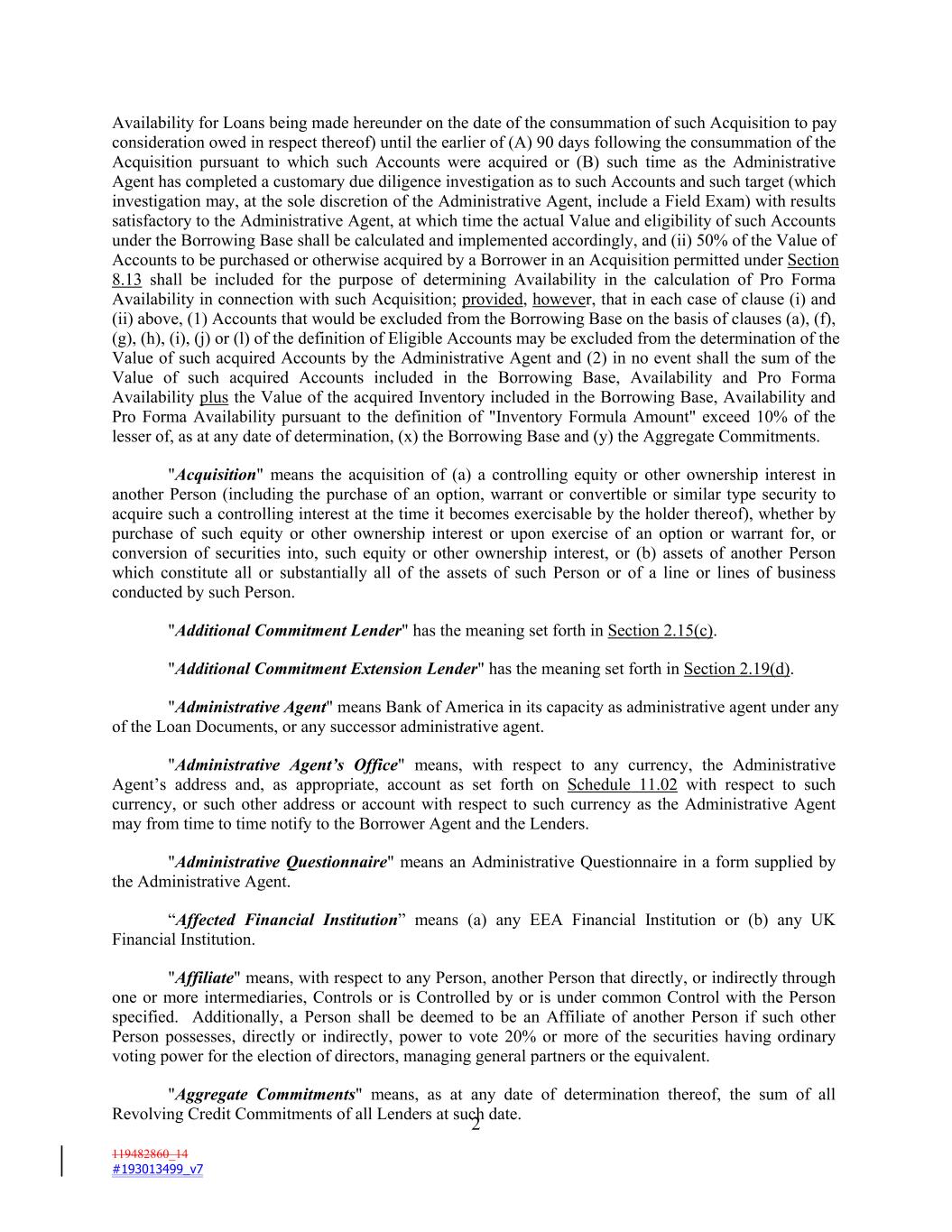 Availability for Loans being made hereunder on the date of the consummation of such Acquisition to pay consideration owed in respect thereof) until the earlier of (A) 90 days following the consummation of the Acquisition pursuant to which such Accounts were acquired or (B) such time as the Administrative Agent has completed a customary due diligence investigation as to such Accounts and such target (which investigation may, at the sole discretion of the Administrative Agent, include a Field Exam) with results satisfactory to the Administrative Agent, at which time the actual Value and eligibility of such Accounts under the Borrowing Base shall be calculated and implemented accordingly, and (ii) 50% of the Value of Accounts to be purchased or otherwise acquired by a Borrower in an Acquisition permitted under Section 8.13 shall be included for the purpose of determining Availability in the calculation of Pro Forma Availability in connection with such Acquisition; provided, however, that in each case of clause (i) and (ii) above, (1) Accounts that would be excluded from the Borrowing Base on the basis of clauses (a), (f), (g), (h), (i), (j) or (l) of the definition of Eligible Accounts may be excluded from the determination of the Value of such acquired Accounts by the Administrative Agent and (2) in no event shall the sum of the Value of such acquired Accounts included in the Borrowing Base, Availability and Pro Forma Availability plus the Value of the acquired Inventory included in the Borrowing Base, Availability and Pro Forma Availability pursuant to the definition of "Inventory Formula Amount" exceed 10% of the lesser of, as at any date of determination, (x) the Borrowing Base and (y) the Aggregate Commitments. "Acquisition" means the acquisition of (a) a controlling equity or other ownership interest in another Person (including the purchase of an option, warrant or convertible or similar type security to acquire such a controlling interest at the time it becomes exercisable by the holder thereof), whether by purchase of such equity or other ownership interest or upon exercise of an option or warrant for, or conversion of securities into, such equity or other ownership interest, or (b) assets of another Person which constitute all or substantially all of the assets of such Person or of a line or lines of business conducted by such Person. "Additional Commitment Lender" has the meaning set forth in Section 2.15(c). "Additional Commitment Extension Lender" has the meaning set forth in Section 2.19(d). "Administrative Agent" means Bank of America in its capacity as administrative agent under any of the Loan Documents, or any successor administrative agent. "Administrative Agent’s Office" means, with respect to any currency, the Administrative Agent’s address and, as appropriate, account as set forth on Schedule 11.02 with respect to such currency, or such other address or account with respect to such currency as the Administrative Agent may from time to time notify to the Borrower Agent and the Lenders. "Administrative Questionnaire" means an Administrative Questionnaire in a form supplied by the Administrative Agent. “Affected Financial Institution” means (a) any EEA Financial Institution or (b) any UK Financial Institution. "Affiliate" means, with respect to any Person, another Person that directly, or indirectly through one or more intermediaries, Controls or is Controlled by or is under common Control with the Person specified. Additionally, a Person shall be deemed to be an Affiliate of another Person if such other Person possesses, directly or indirectly, power to vote 20% or more of the securities having ordinary voting power for the election of directors, managing general partners or the equivalent. "Aggregate Commitments" means, as at any date of determination thereof, the sum of all Revolving Credit Commitments of all Lenders at such date. 2 119482860_14 #193013499_v7