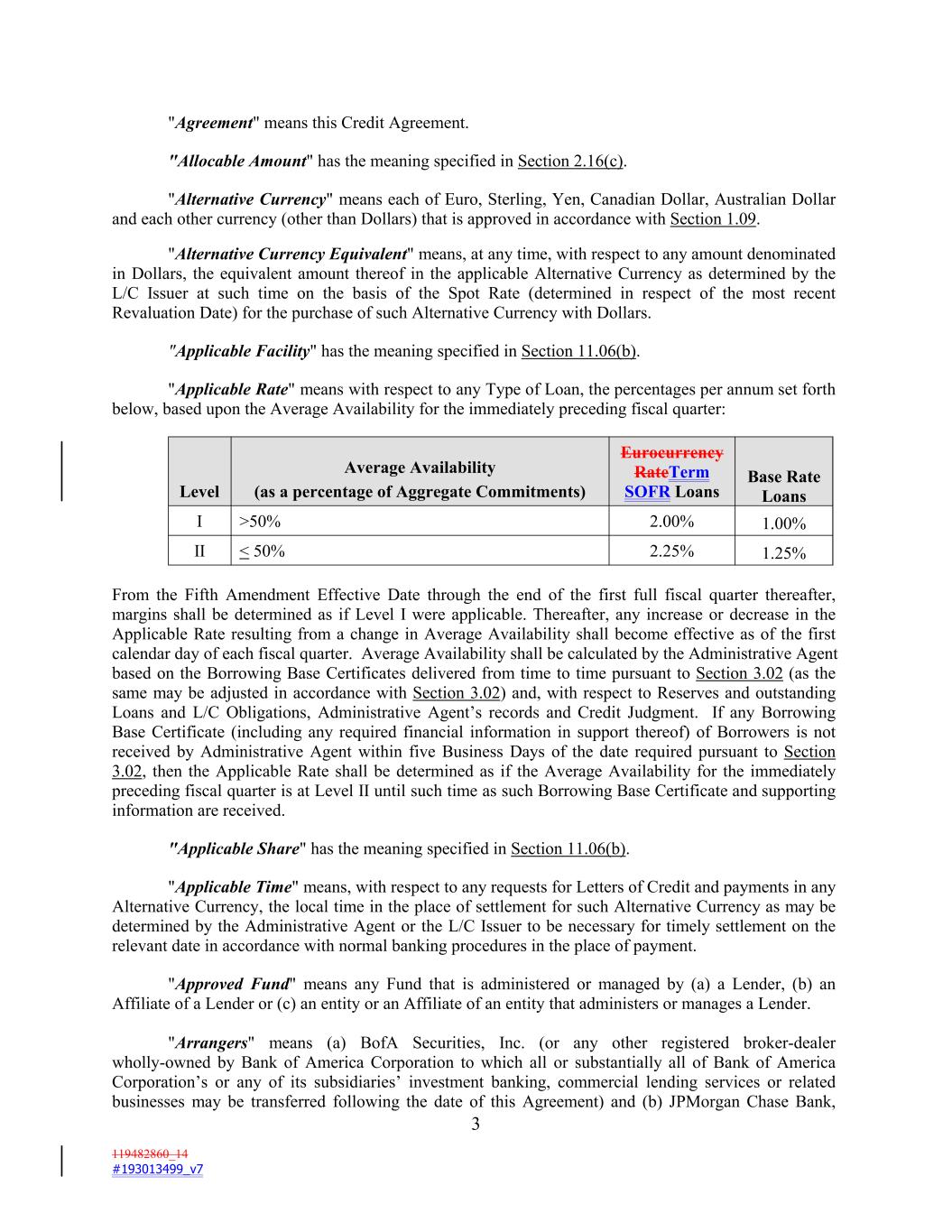 3 119482860_14 #193013499_v7 >50% Average Availability (as a percentage of Aggregate Commitments) 2.00% "Agreement" means this Credit Agreement. "Allocable Amount" has the meaning specified in Section 2.16(c). "Alternative Currency" means each of Euro, Sterling, Yen, Canadian Dollar, Australian Dollar and each other currency (other than Dollars) that is approved in accordance with Section 1.09. "Alternative Currency Equivalent" means, at any time, with respect to any amount denominated in Dollars, the equivalent amount thereof in the applicable Alternative Currency as determined by the L/C Issuer at such time on the basis of the Spot Rate (determined in respect of the most recent Revaluation Date) for the purchase of such Alternative Currency with Dollars. "Applicable Facility" has the meaning specified in Section 11.06(b). "Applicable Rate" means with respect to any Type of Loan, the percentages per annum set forth below, based upon the Average Availability for the immediately preceding fiscal quarter: 1.00% Eurocurrency RateTerm SOFR Loans II Base Rate Loans < 50% 2.25% 1.25% Level From the Fifth Amendment Effective Date through the end of the first full fiscal quarter thereafter, margins shall be determined as if Level I were applicable. Thereafter, any increase or decrease in the Applicable Rate resulting from a change in Average Availability shall become effective as of the first calendar day of each fiscal quarter. Average Availability shall be calculated by the Administrative Agent based on the Borrowing Base Certificates delivered from time to time pursuant to Section 3.02 (as the same may be adjusted in accordance with Section 3.02) and, with respect to Reserves and outstanding Loans and L/C Obligations, Administrative Agent’s records and Credit Judgment. If any Borrowing Base Certificate (including any required financial information in support thereof) of Borrowers is not received by Administrative Agent within five Business Days of the date required pursuant to Section 3.02, then the Applicable Rate shall be determined as if the Average Availability for the immediately preceding fiscal quarter is at Level II until such time as such Borrowing Base Certificate and supporting information are received. "Applicable Share" has the meaning specified in Section 11.06(b). "Applicable Time" means, with respect to any requests for Letters of Credit and payments in any Alternative Currency, the local time in the place of settlement for such Alternative Currency as may be determined by the Administrative Agent or the L/C Issuer to be necessary for timely settlement on the relevant date in accordance with normal banking procedures in the place of payment. "Approved Fund" means any Fund that is administered or managed by (a) a Lender, (b) an Affiliate of a Lender or (c) an entity or an Affiliate of an entity that administers or manages a Lender. "Arrangers" means (a) BofA Securities, Inc. (or any other registered broker-dealer wholly-owned by Bank of America Corporation to which all or substantially all of Bank of America Corporation’s or any of its subsidiaries’ investment banking, commercial lending services or related businesses may be transferred following the date of this Agreement) and (b) JPMorgan Chase Bank, I