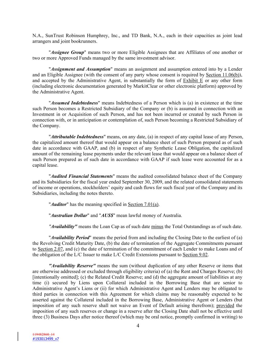 N.A., SunTrust Robinson Humphrey, Inc., and TD Bank, N.A., each in their capacities as joint lead arrangers and joint bookrunners. "Assignee Group" means two or more Eligible Assignees that are Affiliates of one another or two or more Approved Funds managed by the same investment advisor. "Assignment and Assumption" means an assignment and assumption entered into by a Lender and an Eligible Assignee (with the consent of any party whose consent is required by Section 11.06(b)), and accepted by the Administrative Agent, in substantially the form of Exhibit E or any other form (including electronic documentation generated by MarkitClear or other electronic platform) approved by the Administrative Agent. "Assumed Indebtedness" means Indebtedness of a Person which is (a) in existence at the time such Person becomes a Restricted Subsidiary of the Company or (b) is assumed in connection with an Investment in or Acquisition of such Person, and has not been incurred or created by such Person in connection with, or in anticipation or contemplation of, such Person becoming a Restricted Subsidiary of the Company. "Attributable Indebtedness" means, on any date, (a) in respect of any capital lease of any Person, the capitalized amount thereof that would appear on a balance sheet of such Person prepared as of such date in accordance with GAAP, and (b) in respect of any Synthetic Lease Obligation, the capitalized amount of the remaining lease payments under the relevant lease that would appear on a balance sheet of such Person prepared as of such date in accordance with GAAP if such lease were accounted for as a capital lease. "Audited Financial Statements" means the audited consolidated balance sheet of the Company and its Subsidiaries for the fiscal year ended September 30, 2009, and the related consolidated statements of income or operations, stockholders’ equity and cash flows for such fiscal year of the Company and its Subsidiaries, including the notes thereto. "Auditor" has the meaning specified in Section 7.01(a). "Australian Dollar" and "AUS$" mean lawful money of Australia. "Availability" means the Loan Cap as of such date minus the Total Outstandings as of such date. "Availability Period" means the period from and including the Closing Date to the earliest of (a) the Revolving Credit Maturity Date, (b) the date of termination of the Aggregate Commitments pursuant to Section 2.07, and (c) the date of termination of the commitment of each Lender to make Loans and of the obligation of the L/C Issuer to make L/C Credit Extensions pursuant to Section 9.02. "Availability Reserve" means the sum (without duplication of any other Reserve or items that are otherwise addressed or excluded through eligibility criteria) of (a) the Rent and Charges Reserve; (b) [intentionally omitted]; (c) the Related Credit Reserve; and (d) the aggregate amount of liabilities at any time (i) secured by Liens upon Collateral included in the Borrowing Base that are senior to Administrative Agent’s Liens or (ii) for which Administrative Agent and Lenders may be obligated to third parties in connection with this Agreement for which claims may be reasonably expected to be asserted against the Collateral included in the Borrowing Base, Administrative Agent or Lenders (but imposition of any such reserve shall not waive an Event of Default arising therefrom); provided the imposition of any such reserves or change in a reserve after the Closing Date shall not be effective until three (3) Business Days after notice thereof (which may be oral notice, promptly confirmed in writing) to 4 119482860_14 #193013499_v7