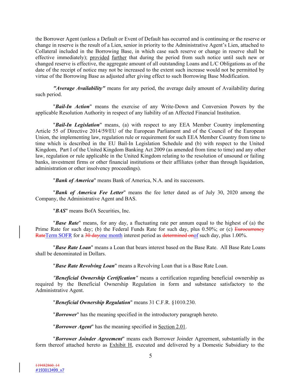 the Borrower Agent (unless a Default or Event of Default has occurred and is continuing or the reserve or change in reserve is the result of a Lien, senior in priority to the Administrative Agent’s Lien, attached to Collateral included in the Borrowing Base, in which case such reserve or change in reserve shall be effective immediately); provided further that during the period from such notice until such new or changed reserve is effective, the aggregate amount of all outstanding Loans and L/C Obligations as of the date of the receipt of notice may not be increased to the extent such increase would not be permitted by virtue of the Borrowing Base as adjusted after giving effect to such Borrowing Base Modification. "Average Availability" means for any period, the average daily amount of Availability during such period. "Bail-In Action" means the exercise of any Write-Down and Conversion Powers by the applicable Resolution Authority in respect of any liability of an Affected Financial Institution. "Bail-In Legislation" means, (a) with respect to any EEA Member Country implementing Article 55 of Directive 2014/59/EU of the European Parliament and of the Council of the European Union, the implementing law, regulation rule or requirement for such EEA Member Country from time to time which is described in the EU Bail-In Legislation Schedule and (b) with respect to the United Kingdom, Part I of the United Kingdom Banking Act 2009 (as amended from time to time) and any other law, regulation or rule applicable in the United Kingdom relating to the resolution of unsound or failing banks, investment firms or other financial institutions or their affiliates (other than through liquidation, administration or other insolvency proceedings). "Bank of America" means Bank of America, N.A. and its successors. "Bank of America Fee Letter" means the fee letter dated as of July 30, 2020 among the Company, the Administrative Agent and BAS. "BAS" means BofA Securities, Inc. "Base Rate" means, for any day, a fluctuating rate per annum equal to the highest of (a) the Prime Rate for such day; (b) the Federal Funds Rate for such day, plus 0.50%; or (c) Eurocurrency RateTerm SOFR for a 30 dayone month interest period as determined onof such day, plus 1.00%. "Base Rate Loan" means a Loan that bears interest based on the Base Rate. All Base Rate Loans shall be denominated in Dollars. "Base Rate Revolving Loan" means a Revolving Loan that is a Base Rate Loan. "Beneficial Ownership Certification" means a certification regarding beneficial ownership as required by the Beneficial Ownership Regulation in form and substance satisfactory to the Administrative Agent. "Beneficial Ownership Regulation" means 31 C.F.R. §1010.230. "Borrower" has the meaning specified in the introductory paragraph hereto. "Borrower Agent" has the meaning specified in Section 2.01. "Borrower Joinder Agreement" means each Borrower Joinder Agreement, substantially in the form thereof attached hereto as Exhibit H, executed and delivered by a Domestic Subsidiary to the 5 119482860_14 #193013499_v7