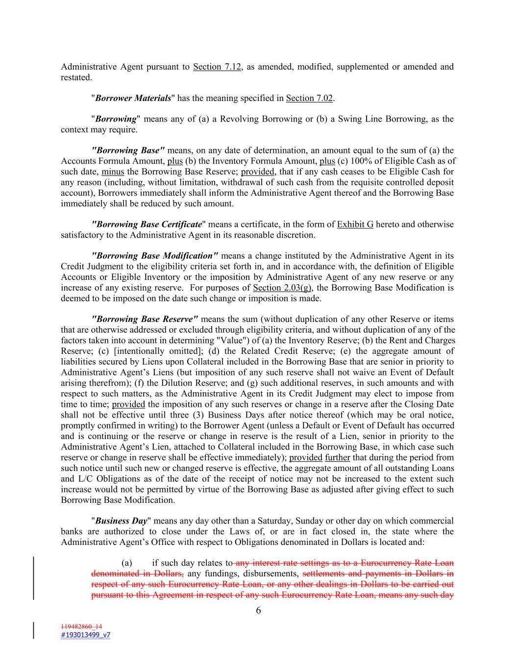 Administrative Agent pursuant to Section 7.12, as amended, modified, supplemented or amended and restated. "Borrower Materials" has the meaning specified in Section 7.02. "Borrowing" means any of (a) a Revolving Borrowing or (b) a Swing Line Borrowing, as the context may require. "Borrowing Base" means, on any date of determination, an amount equal to the sum of (a) the Accounts Formula Amount, plus (b) the Inventory Formula Amount, plus (c) 100% of Eligible Cash as of such date, minus the Borrowing Base Reserve; provided, that if any cash ceases to be Eligible Cash for any reason (including, without limitation, withdrawal of such cash from the requisite controlled deposit account), Borrowers immediately shall inform the Administrative Agent thereof and the Borrowing Base immediately shall be reduced by such amount. "Borrowing Base Certificate" means a certificate, in the form of Exhibit G hereto and otherwise satisfactory to the Administrative Agent in its reasonable discretion. "Borrowing Base Modification" means a change instituted by the Administrative Agent in its Credit Judgment to the eligibility criteria set forth in, and in accordance with, the definition of Eligible Accounts or Eligible Inventory or the imposition by Administrative Agent of any new reserve or any increase of any existing reserve. For purposes of Section 2.03(g), the Borrowing Base Modification is deemed to be imposed on the date such change or imposition is made. "Borrowing Base Reserve" means the sum (without duplication of any other Reserve or items that are otherwise addressed or excluded through eligibility criteria, and without duplication of any of the factors taken into account in determining "Value") of (a) the Inventory Reserve; (b) the Rent and Charges Reserve; (c) [intentionally omitted]; (d) the Related Credit Reserve; (e) the aggregate amount of liabilities secured by Liens upon Collateral included in the Borrowing Base that are senior in priority to Administrative Agent’s Liens (but imposition of any such reserve shall not waive an Event of Default arising therefrom); (f) the Dilution Reserve; and (g) such additional reserves, in such amounts and with respect to such matters, as the Administrative Agent in its Credit Judgment may elect to impose from time to time; provided the imposition of any such reserves or change in a reserve after the Closing Date shall not be effective until three (3) Business Days after notice thereof (which may be oral notice, promptly confirmed in writing) to the Borrower Agent (unless a Default or Event of Default has occurred and is continuing or the reserve or change in reserve is the result of a Lien, senior in priority to the Administrative Agent’s Lien, attached to Collateral included in the Borrowing Base, in which case such reserve or change in reserve shall be effective immediately); provided further that during the period from such notice until such new or changed reserve is effective, the aggregate amount of all outstanding Loans and L/C Obligations as of the date of the receipt of notice may not be increased to the extent such increase would not be permitted by virtue of the Borrowing Base as adjusted after giving effect to such Borrowing Base Modification. "Business Day" means any day other than a Saturday, Sunday or other day on which commercial banks are authorized to close under the Laws of, or are in fact closed in, the state where the Administrative Agent’s Office with respect to Obligations denominated in Dollars is located and: (a) if such day relates to any interest rate settings as to a Eurocurrency Rate Loan denominated in Dollars, any fundings, disbursements, settlements and payments in Dollars in respect of any such Eurocurrency Rate Loan, or any other dealings in Dollars to be carried out pursuant to this Agreement in respect of any such Eurocurrency Rate Loan, means any such day 6 119482860_14 #193013499_v7
