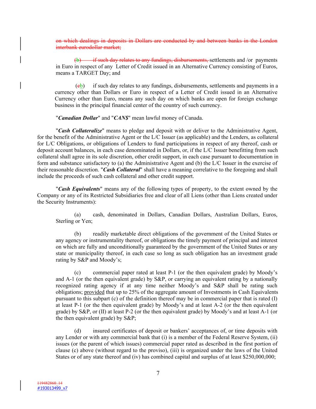 on which dealings in deposits in Dollars are conducted by and between banks in the London interbank eurodollar market; (b) if such day relates to any fundings, disbursements, settlements and /or payments in Euro in respect of any Letter of Credit issued in an Alternative Currency consisting of Euros, means a TARGET Day; and (cb) if such day relates to any fundings, disbursements, settlements and payments in a currency other than Dollars or Euro in respect of a Letter of Credit issued in an Alternative Currency other than Euro, means any such day on which banks are open for foreign exchange business in the principal financial center of the country of such currency. "Canadian Dollar" and "CAN$" mean lawful money of Canada. "Cash Collateralize" means to pledge and deposit with or deliver to the Administrative Agent, for the benefit of the Administrative Agent or the L/C Issuer (as applicable) and the Lenders, as collateral for L/C Obligations, or obligations of Lenders to fund participations in respect of any thereof, cash or deposit account balances, in each case denominated in Dollars, or, if the L/C Issuer benefitting from such collateral shall agree in its sole discretion, other credit support, in each case pursuant to documentation in form and substance satisfactory to (a) the Administrative Agent and (b) the L/C Issuer in the exercise of their reasonable discretion. "Cash Collateral" shall have a meaning correlative to the foregoing and shall include the proceeds of such cash collateral and other credit support. "Cash Equivalents" means any of the following types of property, to the extent owned by the Company or any of its Restricted Subsidiaries free and clear of all Liens (other than Liens created under the Security Instruments): (a) cash, denominated in Dollars, Canadian Dollars, Australian Dollars, Euros, Sterling or Yen; (b) readily marketable direct obligations of the government of the United States or any agency or instrumentality thereof, or obligations the timely payment of principal and interest on which are fully and unconditionally guaranteed by the government of the United States or any state or municipality thereof, in each case so long as such obligation has an investment grade rating by S&P and Moody’s; (c) commercial paper rated at least P-1 (or the then equivalent grade) by Moody’s and A-1 (or the then equivalent grade) by S&P, or carrying an equivalent rating by a nationally recognized rating agency if at any time neither Moody’s and S&P shall be rating such obligations; provided that up to 25% of the aggregate amount of Investments in Cash Equivalents pursuant to this subpart (c) of the definition thereof may be in commercial paper that is rated (I) at least P-1 (or the then equivalent grade) by Moody’s and at least A-2 (or the then equivalent grade) by S&P, or (II) at least P-2 (or the then equivalent grade) by Moody’s and at least A-1 (or the then equivalent grade) by S&P; (d) insured certificates of deposit or bankers’ acceptances of, or time deposits with any Lender or with any commercial bank that (i) is a member of the Federal Reserve System, (ii) issues (or the parent of which issues) commercial paper rated as described in the first portion of clause (c) above (without regard to the proviso), (iii) is organized under the laws of the United States or of any state thereof and (iv) has combined capital and surplus of at least $250,000,000; 7 119482860_14 #193013499_v7