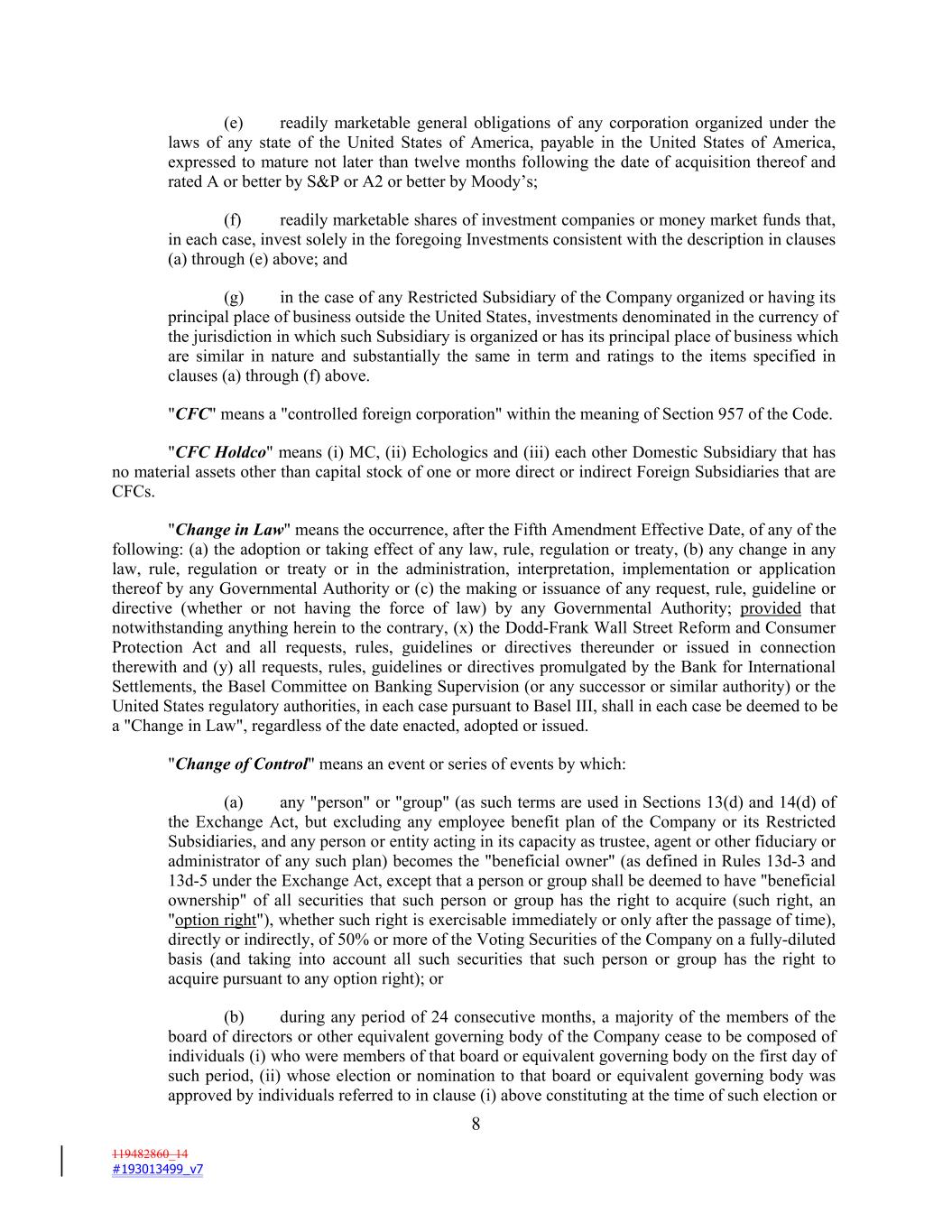 (e) readily marketable general obligations of any corporation organized under the laws of any state of the United States of America, payable in the United States of America, expressed to mature not later than twelve months following the date of acquisition thereof and rated A or better by S&P or A2 or better by Moody’s; (f) readily marketable shares of investment companies or money market funds that, in each case, invest solely in the foregoing Investments consistent with the description in clauses (a) through (e) above; and (g) in the case of any Restricted Subsidiary of the Company organized or having its principal place of business outside the United States, investments denominated in the currency of the jurisdiction in which such Subsidiary is organized or has its principal place of business which are similar in nature and substantially the same in term and ratings to the items specified in clauses (a) through (f) above. "CFC" means a "controlled foreign corporation" within the meaning of Section 957 of the Code. "CFC Holdco" means (i) MC, (ii) Echologics and (iii) each other Domestic Subsidiary that has no material assets other than capital stock of one or more direct or indirect Foreign Subsidiaries that are CFCs. "Change in Law" means the occurrence, after the Fifth Amendment Effective Date, of any of the following: (a) the adoption or taking effect of any law, rule, regulation or treaty, (b) any change in any law, rule, regulation or treaty or in the administration, interpretation, implementation or application thereof by any Governmental Authority or (c) the making or issuance of any request, rule, guideline or directive (whether or not having the force of law) by any Governmental Authority; provided that notwithstanding anything herein to the contrary, (x) the Dodd-Frank Wall Street Reform and Consumer Protection Act and all requests, rules, guidelines or directives thereunder or issued in connection therewith and (y) all requests, rules, guidelines or directives promulgated by the Bank for International Settlements, the Basel Committee on Banking Supervision (or any successor or similar authority) or the United States regulatory authorities, in each case pursuant to Basel III, shall in each case be deemed to be a "Change in Law", regardless of the date enacted, adopted or issued. "Change of Control" means an event or series of events by which: (a) any "person" or "group" (as such terms are used in Sections 13(d) and 14(d) of the Exchange Act, but excluding any employee benefit plan of the Company or its Restricted Subsidiaries, and any person or entity acting in its capacity as trustee, agent or other fiduciary or administrator of any such plan) becomes the "beneficial owner" (as defined in Rules 13d-3 and 13d-5 under the Exchange Act, except that a person or group shall be deemed to have "beneficial ownership" of all securities that such person or group has the right to acquire (such right, an "option right"), whether such right is exercisable immediately or only after the passage of time), directly or indirectly, of 50% or more of the Voting Securities of the Company on a fully-diluted basis (and taking into account all such securities that such person or group has the right to acquire pursuant to any option right); or (b) during any period of 24 consecutive months, a majority of the members of the board of directors or other equivalent governing body of the Company cease to be composed of individuals (i) who were members of that board or equivalent governing body on the first day of such period, (ii) whose election or nomination to that board or equivalent governing body was approved by individuals referred to in clause (i) above constituting at the time of such election or 8 119482860_14 #193013499_v7