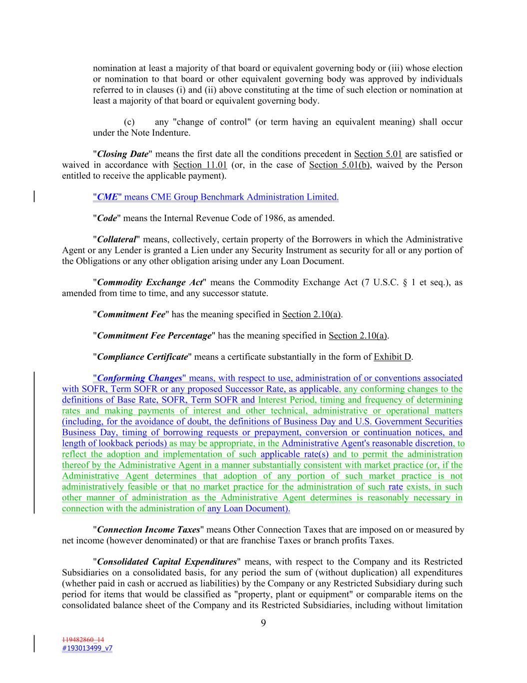 nomination at least a majority of that board or equivalent governing body or (iii) whose election or nomination to that board or other equivalent governing body was approved by individuals referred to in clauses (i) and (ii) above constituting at the time of such election or nomination at least a majority of that board or equivalent governing body. (c) any "change of control" (or term having an equivalent meaning) shall occur under the Note Indenture. "Closing Date" means the first date all the conditions precedent in Section 5.01 are satisfied or waived in accordance with Section 11.01 (or, in the case of Section 5.01(b), waived by the Person entitled to receive the applicable payment). "CME" means CME Group Benchmark Administration Limited. "Code" means the Internal Revenue Code of 1986, as amended. "Collateral" means, collectively, certain property of the Borrowers in which the Administrative Agent or any Lender is granted a Lien under any Security Instrument as security for all or any portion of the Obligations or any other obligation arising under any Loan Document. "Commodity Exchange Act" means the Commodity Exchange Act (7 U.S.C. § 1 et seq.), as amended from time to time, and any successor statute. "Commitment Fee" has the meaning specified in Section 2.10(a). "Commitment Fee Percentage" has the meaning specified in Section 2.10(a). "Compliance Certificate" means a certificate substantially in the form of Exhibit D. "Conforming Changes" means, with respect to use, administration of or conventions associated with SOFR, Term SOFR or any proposed Successor Rate, as applicable, any conforming changes to the definitions of Base Rate, SOFR, Term SOFR and Interest Period, timing and frequency of determining rates and making payments of interest and other technical, administrative or operational matters (including, for the avoidance of doubt, the definitions of Business Day and U.S. Government Securities Business Day, timing of borrowing requests or prepayment, conversion or continuation notices, and length of lookback periods) as may be appropriate, in the Administrative Agent's reasonable discretion, to reflect the adoption and implementation of such applicable rate(s) and to permit the administration thereof by the Administrative Agent in a manner substantially consistent with market practice (or, if the Administrative Agent determines that adoption of any portion of such market practice is not administratively feasible or that no market practice for the administration of such rate exists, in such other manner of administration as the Administrative Agent determines is reasonably necessary in connection with the administration of any Loan Document). "Connection Income Taxes" means Other Connection Taxes that are imposed on or measured by net income (however denominated) or that are franchise Taxes or branch profits Taxes. "Consolidated Capital Expenditures" means, with respect to the Company and its Restricted Subsidiaries on a consolidated basis, for any period the sum of (without duplication) all expenditures (whether paid in cash or accrued as liabilities) by the Company or any Restricted Subsidiary during such period for items that would be classified as "property, plant or equipment" or comparable items on the consolidated balance sheet of the Company and its Restricted Subsidiaries, including without limitation 9 119482860_14 #193013499_v7
