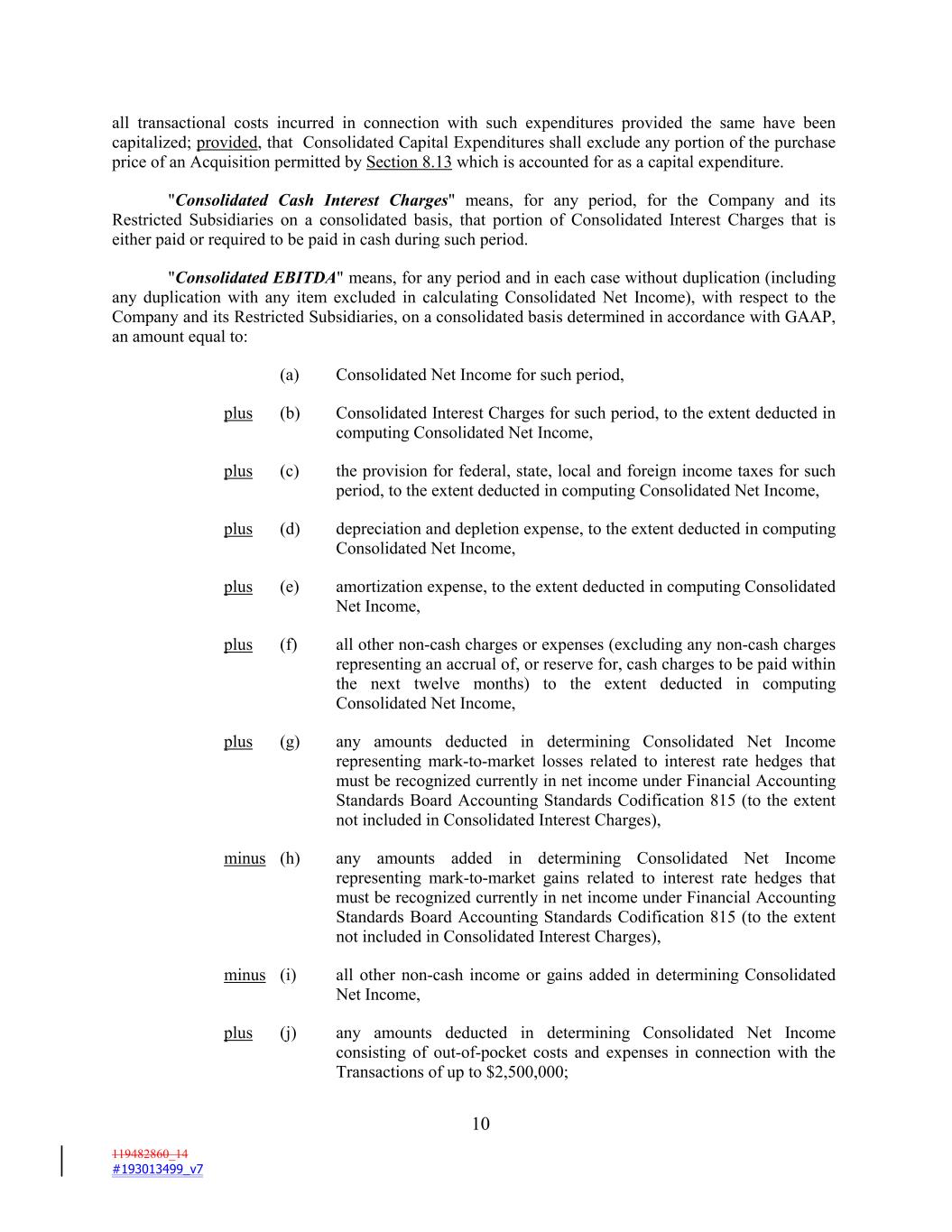 all transactional costs incurred in connection with such expenditures provided the same have been capitalized; provided, that Consolidated Capital Expenditures shall exclude any portion of the purchase price of an Acquisition permitted by Section 8.13 which is accounted for as a capital expenditure. "Consolidated Cash Interest Charges" means, for any period, for the Company and its Restricted Subsidiaries on a consolidated basis, that portion of Consolidated Interest Charges that is either paid or required to be paid in cash during such period. "Consolidated EBITDA" means, for any period and in each case without duplication (including any duplication with any item excluded in calculating Consolidated Net Income), with respect to the Company and its Restricted Subsidiaries, on a consolidated basis determined in accordance with GAAP, an amount equal to: (a) Consolidated Net Income for such period, plus (b) Consolidated Interest Charges for such period, to the extent deducted in computing Consolidated Net Income, plus (c) the provision for federal, state, local and foreign income taxes for such period, to the extent deducted in computing Consolidated Net Income, plus (d) depreciation and depletion expense, to the extent deducted in computing Consolidated Net Income, plus (e) amortization expense, to the extent deducted in computing Consolidated Net Income, plus (f) all other non-cash charges or expenses (excluding any non-cash charges representing an accrual of, or reserve for, cash charges to be paid within the next twelve months) to the extent deducted in computing Consolidated Net Income, plus (g) any amounts deducted in determining Consolidated Net Income representing mark-to-market losses related to interest rate hedges that must be recognized currently in net income under Financial Accounting Standards Board Accounting Standards Codification 815 (to the extent not included in Consolidated Interest Charges), minus (h) any amounts added in determining Consolidated Net Income representing mark-to-market gains related to interest rate hedges that must be recognized currently in net income under Financial Accounting Standards Board Accounting Standards Codification 815 (to the extent not included in Consolidated Interest Charges), minus (i) all other non-cash income or gains added in determining Consolidated Net Income, plus (j) any amounts deducted in determining Consolidated Net Income consisting of out-of-pocket costs and expenses in connection with the Transactions of up to $2,500,000; 10 119482860_14 #193013499_v7